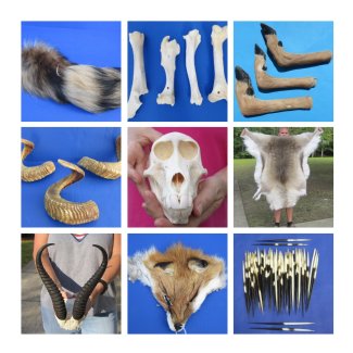 We have a wide range of animal products for sale. Our selection includes animal bones for carving, animal skins and hides for home decor and crafts, animal skulls for display, painting and carving, porcupine quills and turtle shells for Native American arts and crafts and taxidermy piranha fish on stands. All of our animal products originate from the farming industry or Government culling programs.