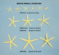 If you need white starfish in bulk, we have white finger starfish wholesale in bulk, white pencil starfish from 2 inches in size up to 10 inches for starfish crafts.  White starfish are perfect for making starfish wedding favors, white starfish decorations and white starfish ornaments.  If you are looking for white finger starfish wholesale in bulk for wedding or reception decor, we have the size for your craft project.  These white pencil starfish can be easily spray painted to match any decor and if you are making starfish ornaments, you can easily throw some glitter and a bow on these starfish and they become a pretty starfish ornament or can be attached to a gift box as a decorative tag. A favorite for seashell wreaths and coastal inspired shell mirrors.