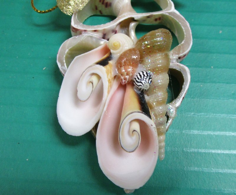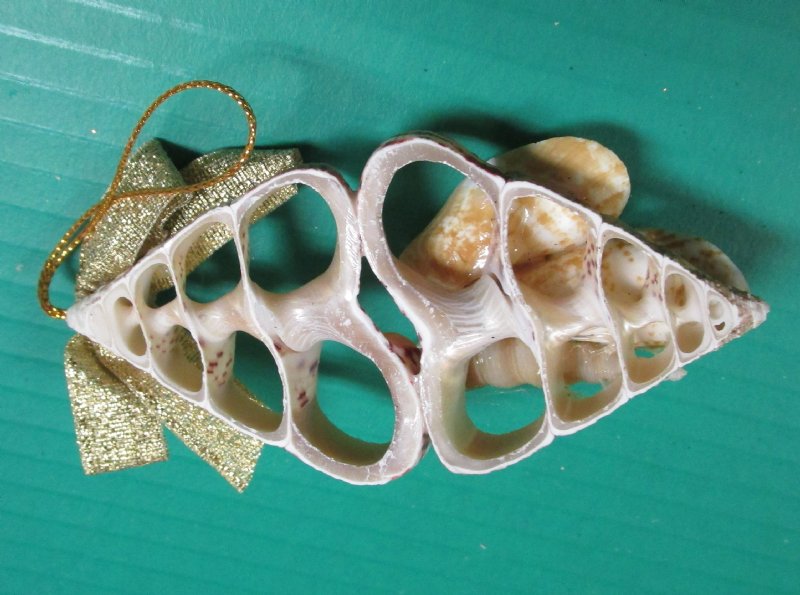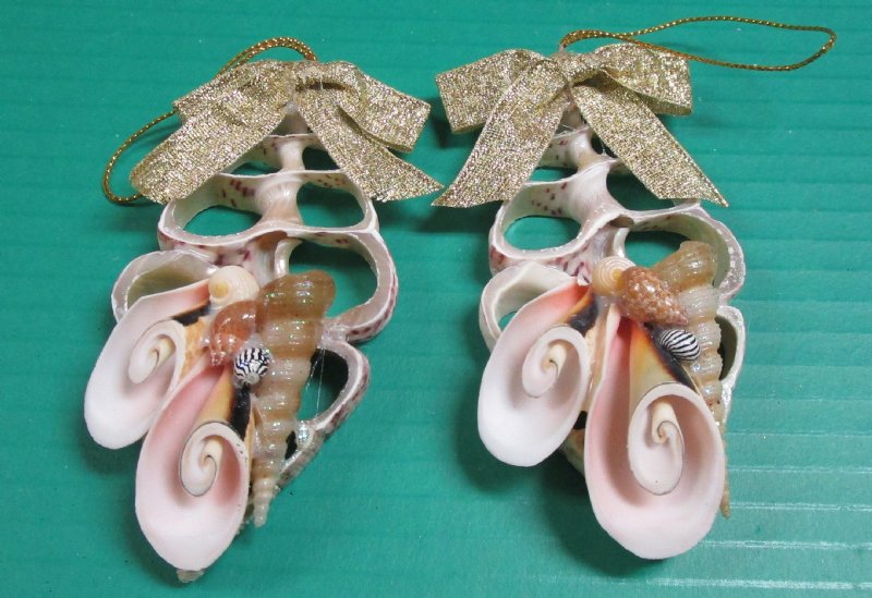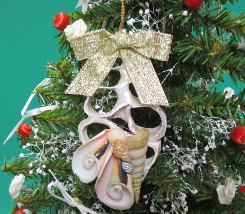 Wholesale Center Cut Trochus with tiny shells and gold bow ornament.  These ornaments are hand crafted and measure approximately 4 inches long and 2 inches in wide (not counting the hanger). Seashell ornaments are popular with collectors and shell ornaments sell year-round, are easy to transport, and are an inexpensive gift your customers can give to co-workers, neighbors, family, and friends. Whether you have a beach shops, Christmas shop or  souvenir and gift shop our shell ornaments will be an item you cannot be without.