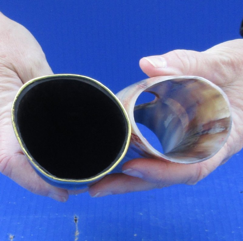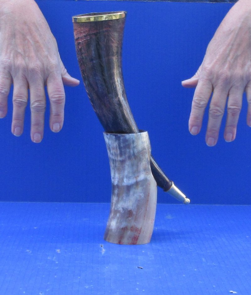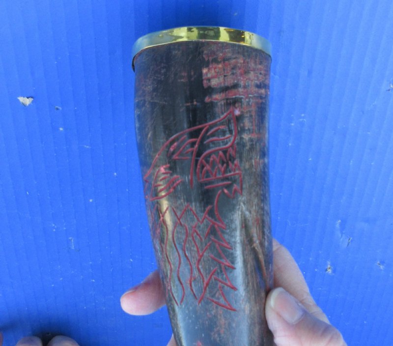 Drinking horns with Engraved Red colored Wolf Design, Brass trim, gold colored finial tip and Horn Stand (Bubalus bubalis) for sale from India measuring approximately 12 inches, measured around the curve of the horn.  They are Real -- NOT REPLICAS, and will have natural imperfections.  This Polished buffalo horns can be used for cabin decor or rustic decorating.