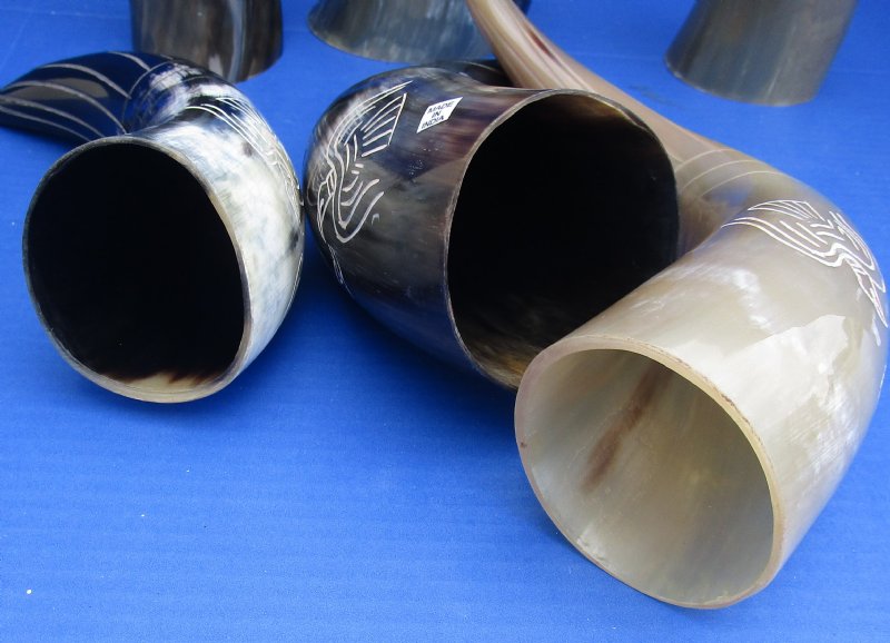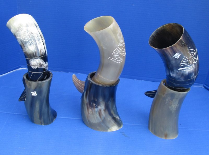 Wholesale Decorative Carved Cattle/Cow horn and horn stand with a Bird Design, Viking Drinking horns for sale from India for use in home decorating. These horns measure approximately 12 inches to 13 inches, measured around the curve of the horn using a cloth tape measure, not up and down with a ruler.  The horn stand measures approximately  5 inches to 5-1/4 inches.  They are Real -- NOT REPLICAS, and will have natural imperfections.  No 2 will be identical.  They will vary in size, shape and coloring.  These Decorative carved cattle/cow horns can be used for cabin decor or rustic decorating.  We DO NOT recommend drinking out of these horns.