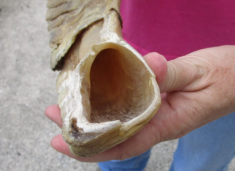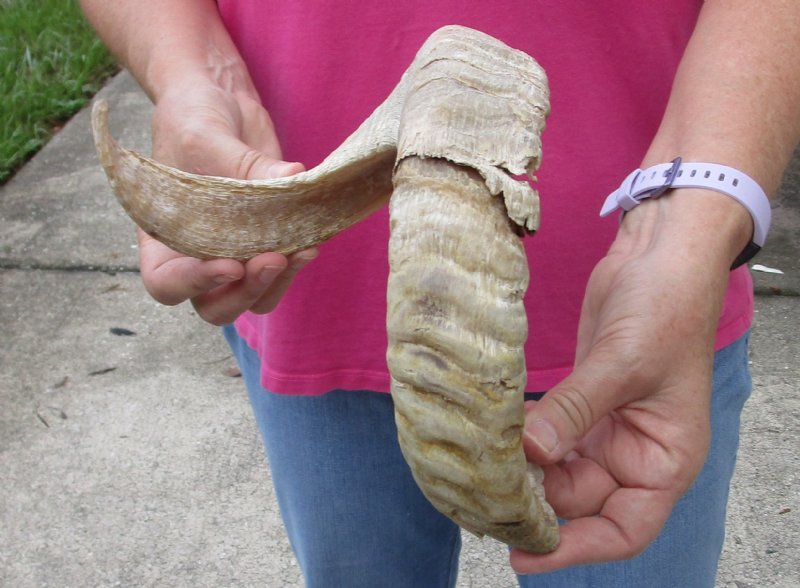 This is a #2 Grade sheep (Ovis Aries) horn that measures approximately 24 inches in size. This is a damaged / discounted horn - Damage around middle of horn - review photos.  This horn will have natural imperfections including gouges, holes, splits, missing sections of top layer, etc. from aging and fighting. Sheep horns are measured around the curl of the horn - not straight.  Sheep horns are used in making  blowing horns, furniture legs, lamps, sconces, knife handles, cane handles, inlaid crafts and numerous other taxidermy crafts. Our ram horns are a by-product of the farming industry and Government culling programs. Our ram horns are imported from India and South Africa.