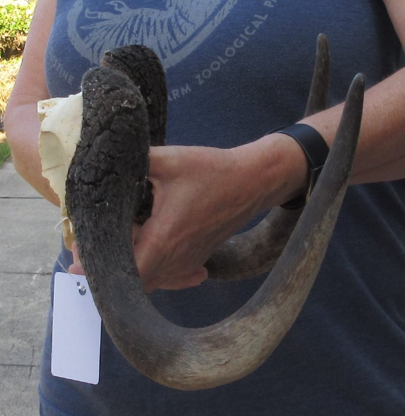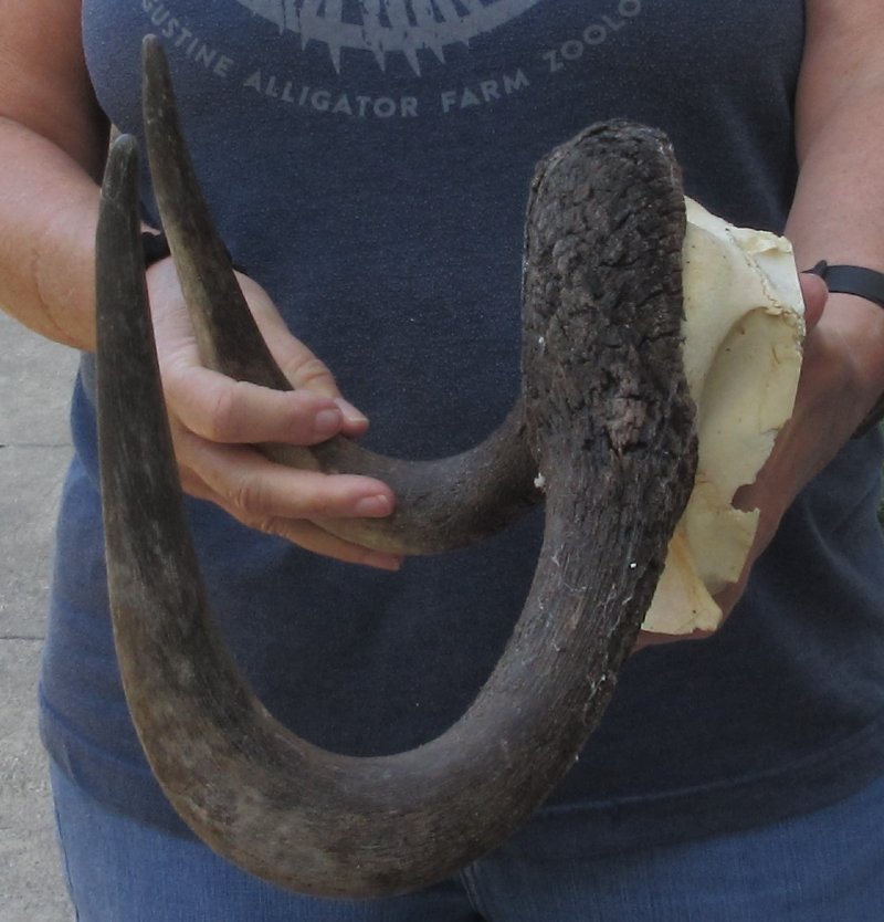 B-Grade Female African black wildebeest skull plate with horns for cabin decor and lodge decorWorm hole in one horn - review photos  This black wildebeest skull plate has horns approximately 14 inches wide.