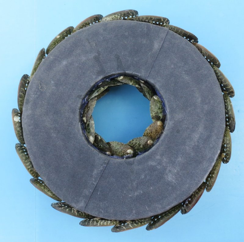 Wholesale abalone shell wreath measuring approximately 10 inches across and 3-1/4 inches thick. This round abalone shell wreath has a foam form and is decoratively covered with rows of shiny abalone shells that cast a silver tone. This pearly silver shell wreath wall art is made out of real small abalone shells does not have a wall hanger but can be used as a candle holder.