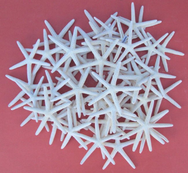 Wholesale off small white pencil starfish, or small finger starfish, measuring approximately 2 inches to 2-7/8 inches in size (SOME WILL BE A LITTLE UNDER OR OVER THE SIZE) are perfect for making beach wedding favors, and as accents in seashell centerpieces and as table decorations. These are also used in numerous starfish crafts.  If you are making white starfish ornaments, this is the perfect size to simply sprinkle some glitter on the starfish and then attach a bow to make a pretty Christmas ornament or gift box tag.  You can easily spray paint these starfish to match any decor and if you are need wedding starfish, these off white finger star fish will meet your needs.