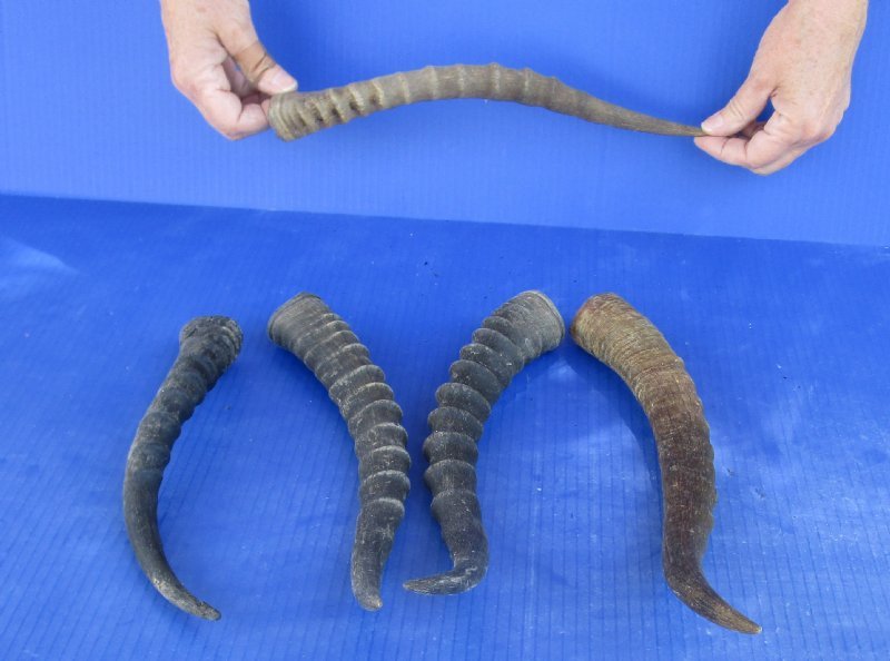 5 piece lot of Female Blesbok horns or blesbuck horns from wild African blesbok, with natural imperfections, measuring approximately 10 to 13 inches long measured around the curve of the horns -- not straight.  Blesbok horns, blesbuck horns, are used in making furniture, cane handles and in numerous taxidermy crafts. These are real blesbok horns and they will have natural imperfections from living in the wild and using their horns for fighting, such as tiny chips and small splits at the mouth opening, tiny cuts, scars, blemishes, etc.