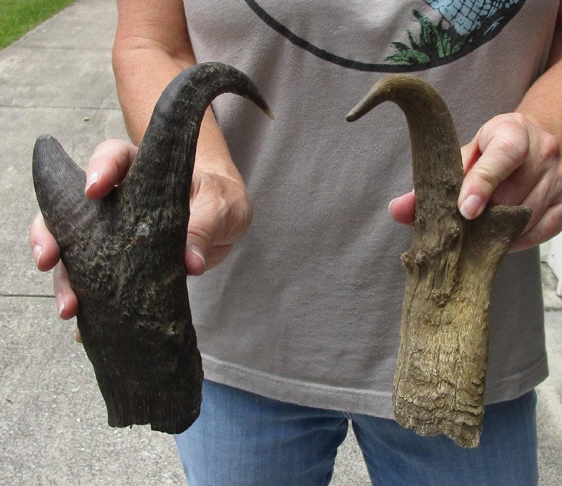2 piece lot of North American Pronghorn (Antilocapra americana) horns measuring approximately 10-1/2 and 12 inches long.   The prong horn is a species of artiodactyl (even-toed, hoofed) mammal indigenous to interior western and central North America.  There will be imperfections due to the natural aging process and living in the wild--scars, blemishes, rub areas, etc.  Because this is a natural product, it does have an odor.