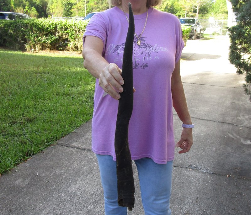 Female (Cow) Eland horn (Taurotragus oryx), measured around the curl, imported from South Africa. This eland bull horn measures approximately 25 inches.  Review all photos.  Eland horns are used in making shofars, blowing horns, eland horn instruments, furniture legs, lamps, sconces, knife handles, cane handles, inlaid crafts and numerous other taxidermy crafts.