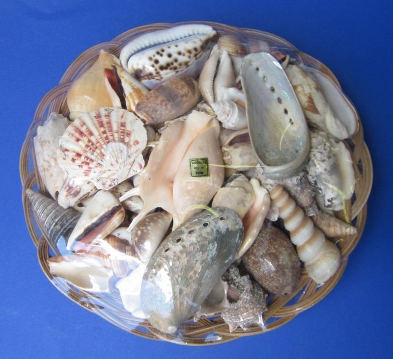 8 inches round wholesale shell gift baskets for seashell wedding decor filled with natural assorted mixed seashells. Our 8 inches round shell gift baskets are filled with tiger clams, hawkwings, goldmouth turbos, pecten shells, arabic cowrie, trochus snail, cockles, abalone shells, murex endiva, lambis lambis, canarium, strawberry strombus, Japanese land snails, turritella, and many more pretty shells. Seashell gift baskets make perfect seashell gifts and are great for beach themed decorating and coastal decor.