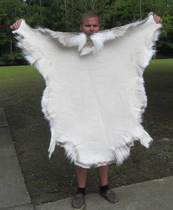 Standard Grade Tanned Reindeer hides, reindeer skins wholesale and reindeer fur, farm raised for food, imported from Finland.   Our reindeer hides, reindeer skins wholesale and reindeer fur are professionally tanned and imported from Finland.  These Finland reindeer fur and reindeer skins vary in size, and average 50 inches to 60 inches long by 46 inches to 53 inches wide. Reindeer skins, hides and reindeer fur look great as wall decoration in a cabin or den, as furniture throws or decorative rugs but should not be walked or stepped on, to prevent shedding and breaking of the fur. Reindeer skins and hides should be cleaned once a year with a standard vacuum on the lowest power.