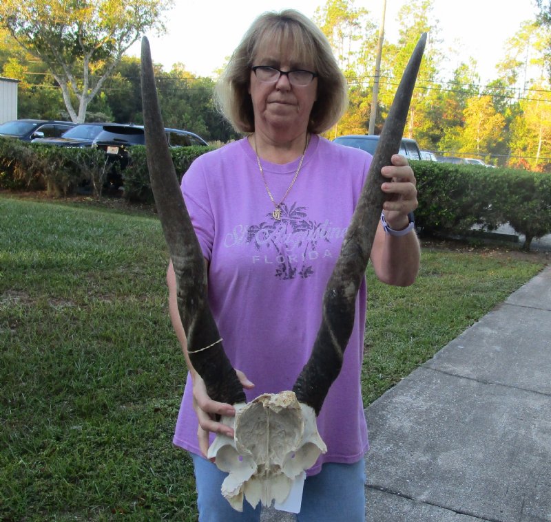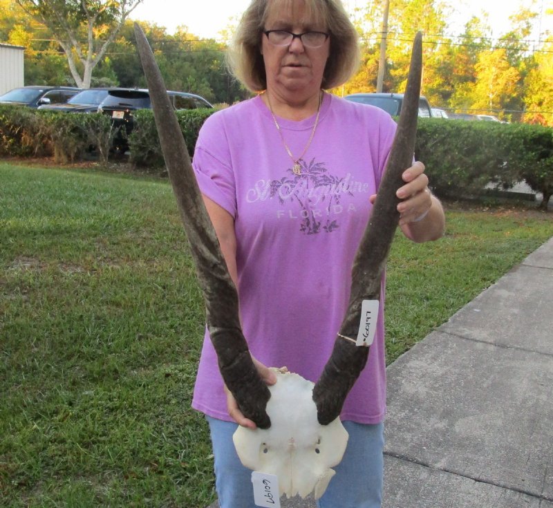 Female Eland (Taurotragus oryx) Skull Plate with 27 and 28 inch Horns for rustic cabin decor, measured around the curve of the horn. For rustic cabin decor.    Review photos. This Eland skull plate was imported from South Africa and obtained from the African government's culling program and the farming industry. Eland skulls are used in cabin and hunting lodge decorating as wall mounts over fireplaces and as wall accents. We are direct importers of African animal skulls and horns and animal products.