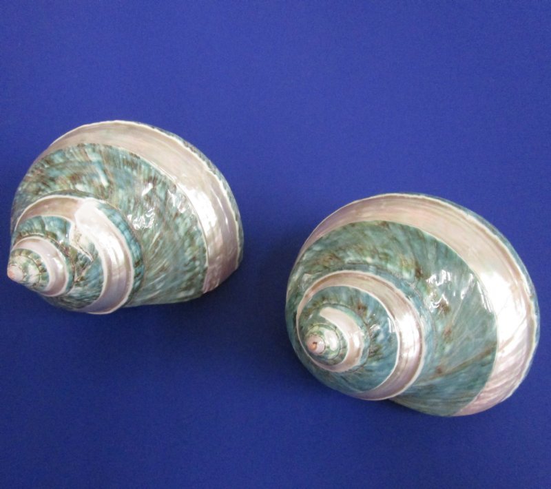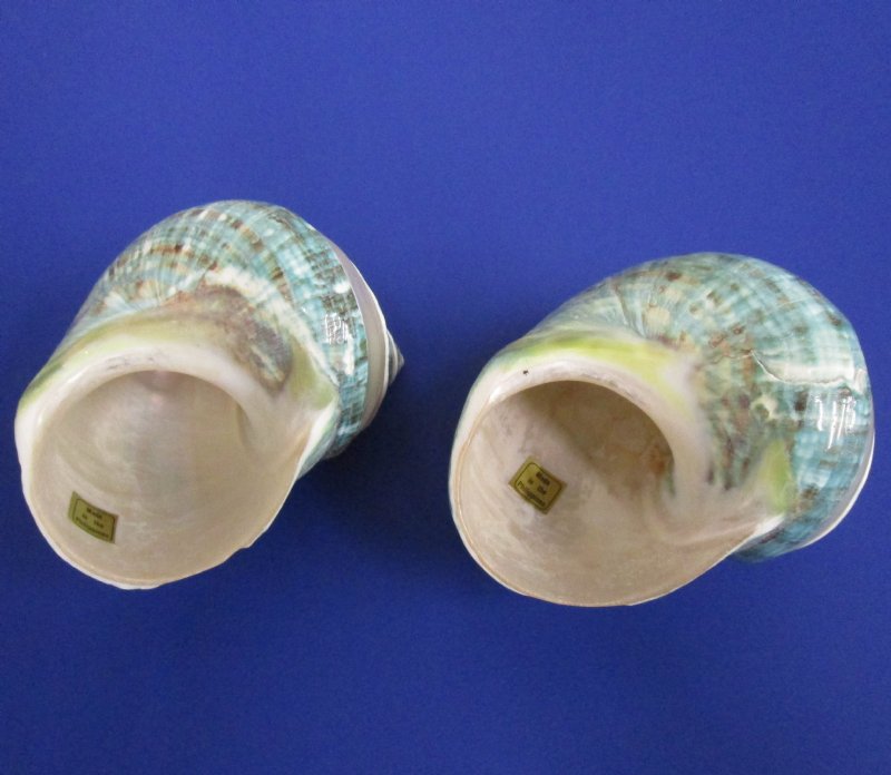 Wholesale polished jade turbo with pearl band shells imported from Philippines measuring 3 inches to 3-1/2 inches in size. These beautiful polished jade turbo with pearl band shells are used in coastal home decorating and are perfect for use in shell baskets, glass containers and for collectors and seashell decorating. These are real shells - NOT replicas and will have natural imperfections from living in the ocean and aging -- tiny holes, indentations, chips, scars and blemishes.  They will vary in shape, size and shading.