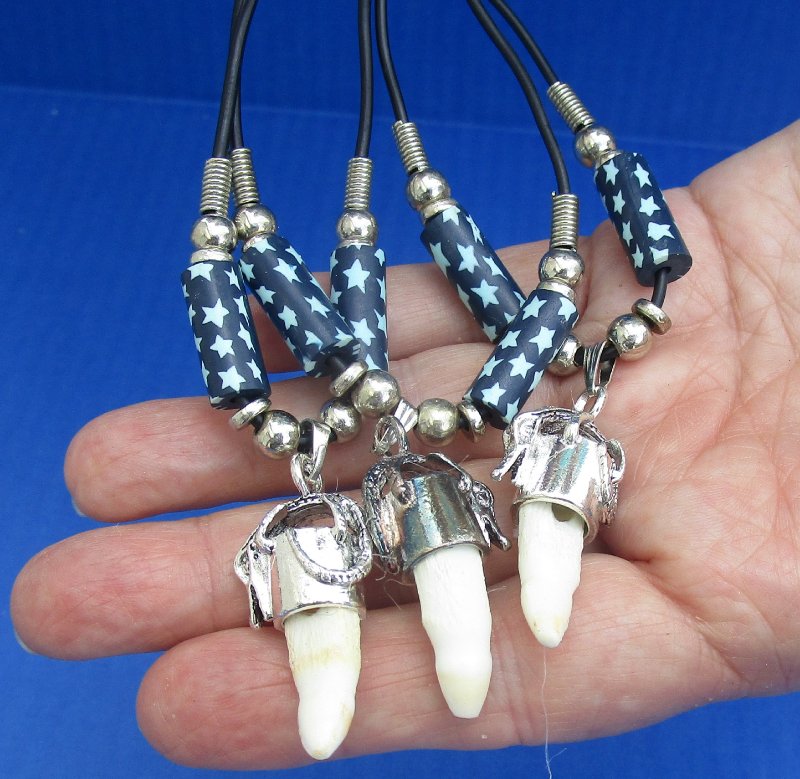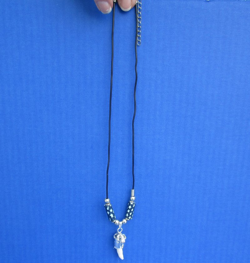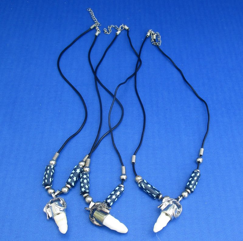 Wholesale alligator tooth necklaces measuring approximately 20 inches with 1/2 inch to 1-1/2 inch with white stars on navy blue beads and a silver cap with a tiny silver gator on a black leather strap. These necklaces are made with Real Alligator Teeth - Not Replicas.  They will vary in size, shape and coloring.  Some will have natural staining on the tooth.  These alligator tooth necklaces make perfect birthday party favors and gifts for gator lovers.