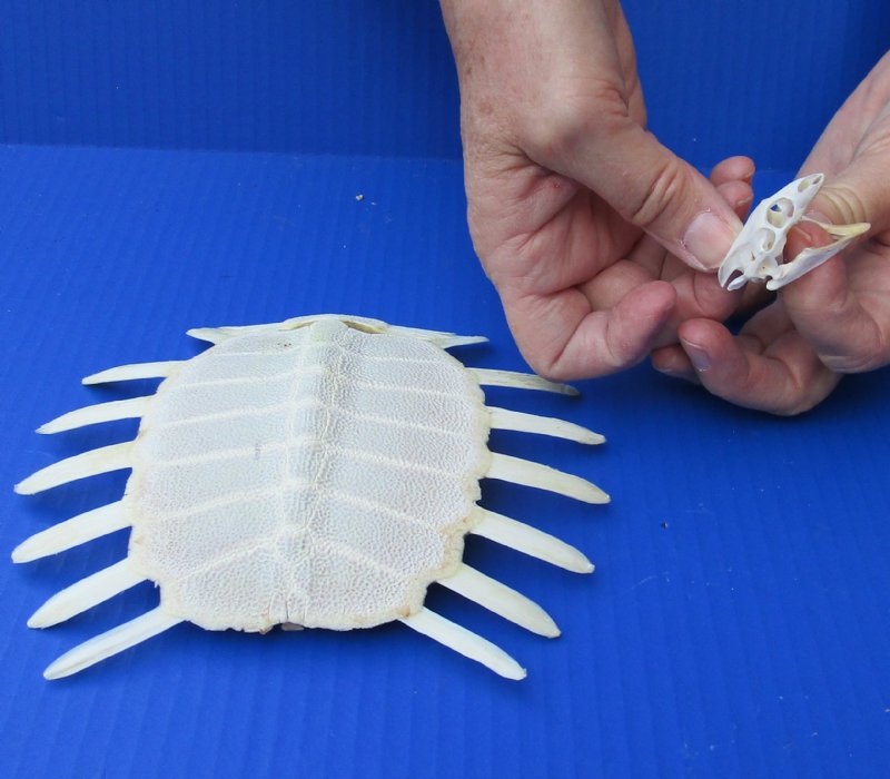 Soft Shell Turtle skull measuring approximately 1-3/4 inches long and 7/8 inches wide and soft shell turtle shell measuring approximately 6 inches long and 6-3/4 inches wide. Turtle skulls can be used in Native American crafts. This softshell turtle shell will have natural imperfections from the turtle living in the water and the aging process.