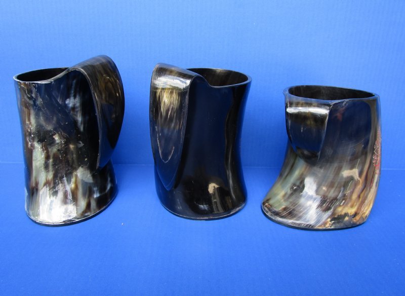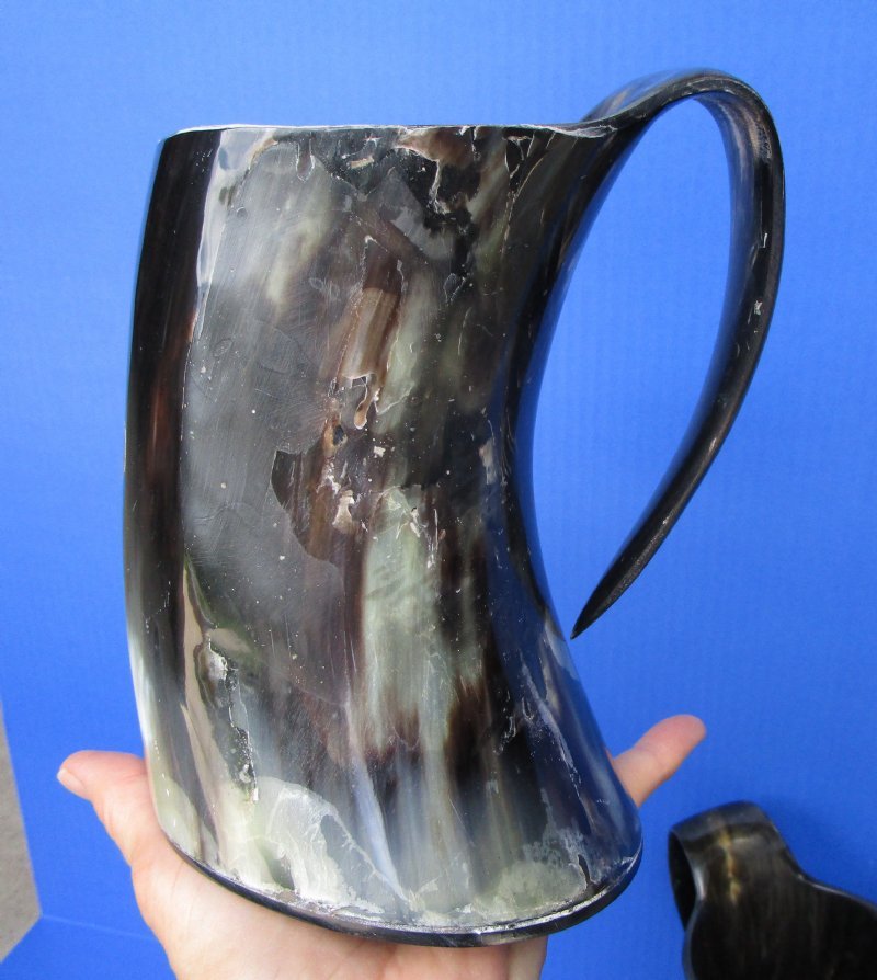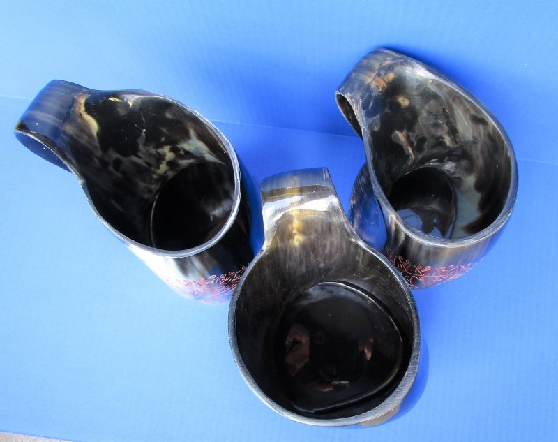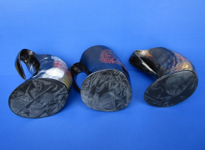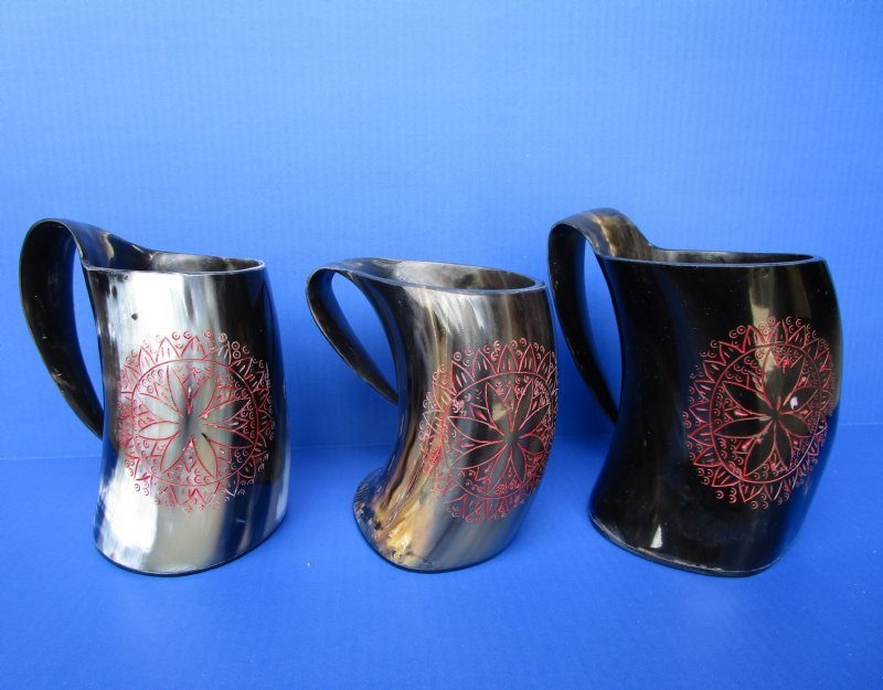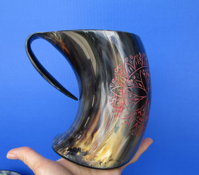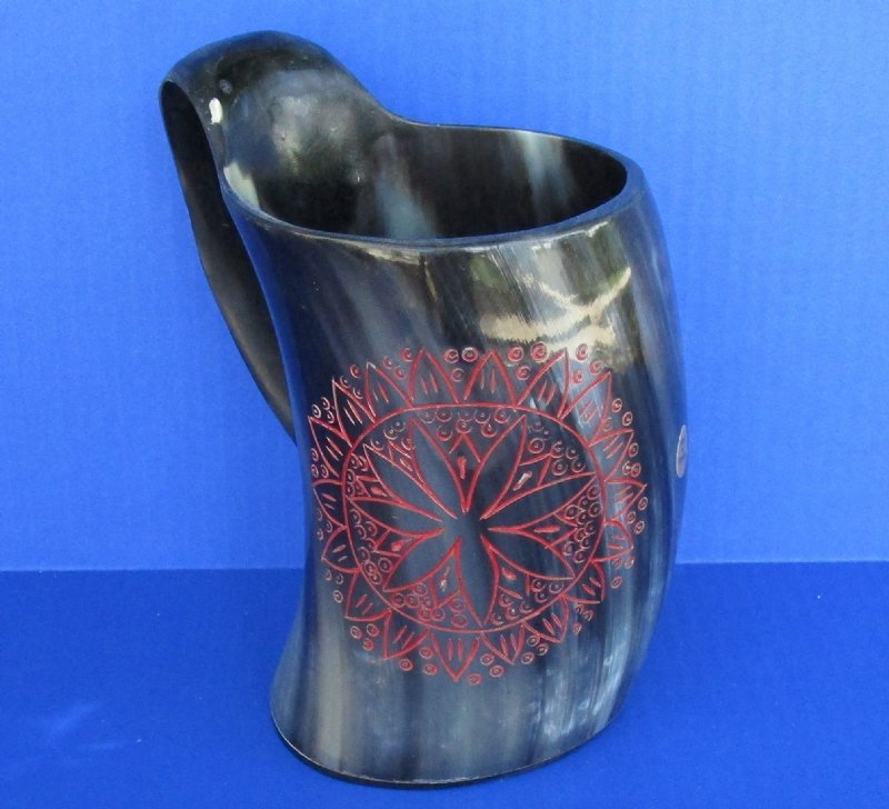 Wholesale Buffalo Horn Mug with an Carved Red Emblem, also called Viking Horn Tankard. They measure approximately 6 inches by 6 inches to 6-1/4 inches by 6-1/2 inches, including the handle. Our buffalo horn mugs will vary in coloring, shape, size and weight. No 2 will be identical. They all have a marble look with a variation of color combinations. These natural buffalo horn mugs are made using traditional methods which make an excellent re-enactment piece. The exterior has been hand polished and includes a horn handle. DO NOT fill with hot food or beverages - the surface will be damaged. NOT DISWASHER SAFE - MUST BE HAND WASHED. This is a Natural Product - USE AS A DECORATIVE PIECE ONLY. Not for Use as a Drinking Mug. This item will have a slight odor and may have minor scratches, natural blemishes and other imperfections due to buffing and the natural material used. The variations in shape and color can only be made by nature: thus a horn may have natural blemishes which will not affect its use, but does verify its authenticity.