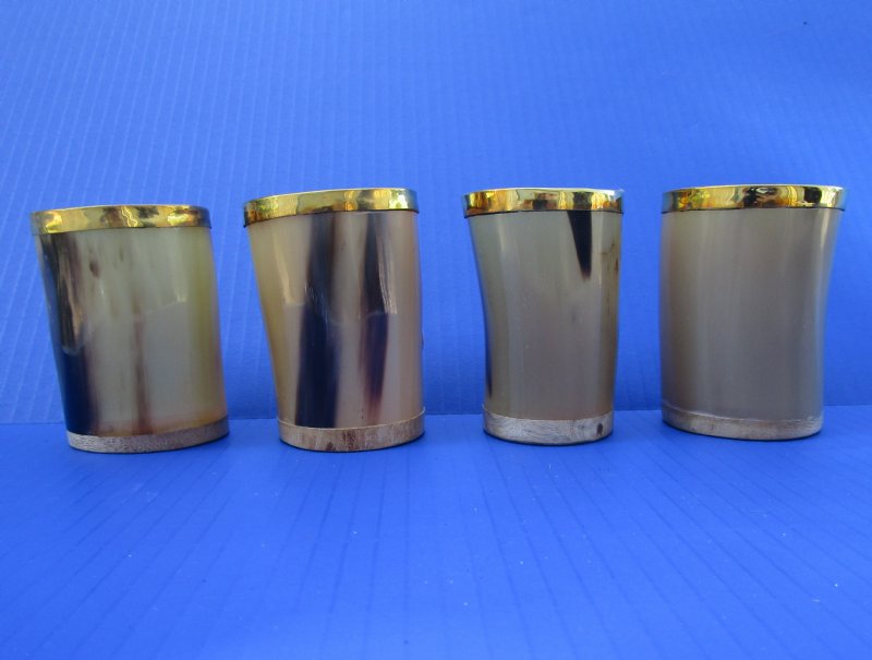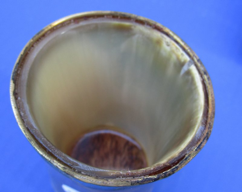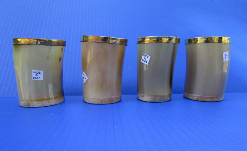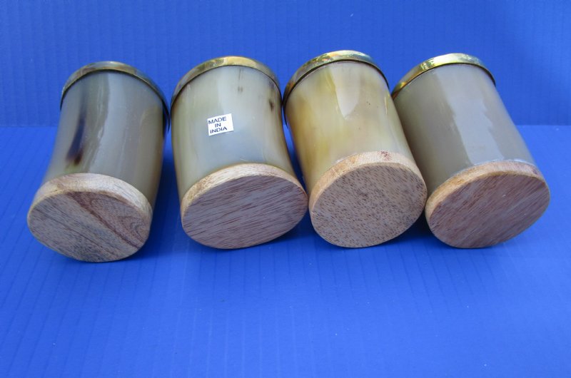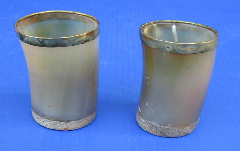 Wholesale Tan color Buffalo Viking Drinking Horn Shot Glass/cup with Brass Trim and Wood base - 3 inches tall - 2 pcs @ $7.75 each;