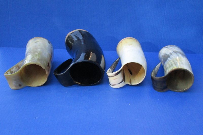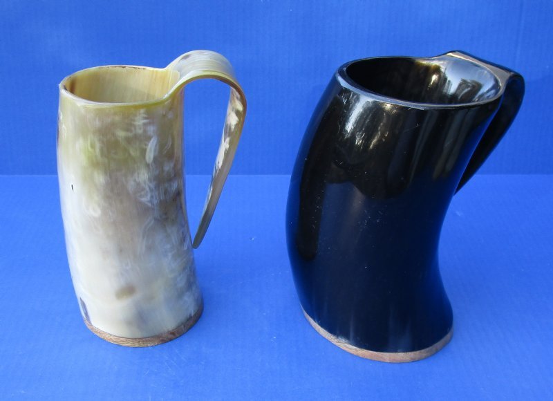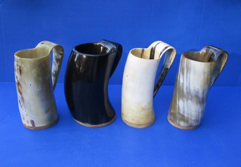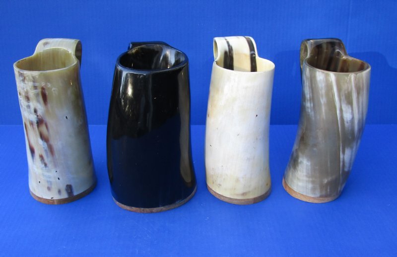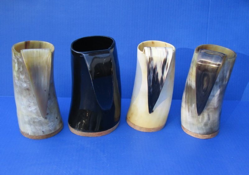 Wholesale Polished buffalo horn mugs with wood base/bottom measuring approximately 5 inches tall, measured from the base of the mug to the top of the handle. These natural buffalo horn mugs with rustic look are made using traditional methods which make an excellent re-enactment piece. The exterior has been hand polished and not recommend drinking from them. This item will have a slight odor and may have minor scratches due to buffing and the natural material used. The variations in shape and color can only be made by nature: thus a horn may have natural blemishes which will not affect its use, but does verify its authenticity.