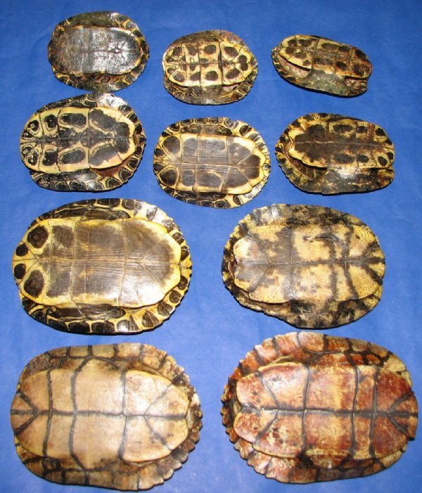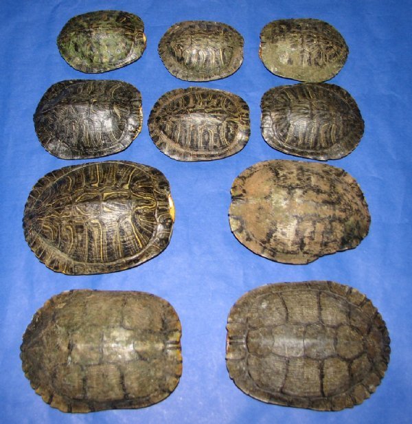 Wholesale red eared slider turtle shells, that need additional cleaning, measure between 6 inches and 6-7/8 inches in length. Some of these slider turtle shells will have dried green and brown algae on the tops and need additional cleaning to remove the algae. The shells of the red eared slider turtle are used in Native American crafts.The red eared slider is a cold-blooded animal and will usually be found during the day sitting in the sun on a rock, log, or any stumps that are near the water. Some red eared sliders can even be found up to three high basking in the sun. While the red eared slider is very hard of hearing they are sensitive to vibration they are very alert while they are basking. These vibrations allow the red eared slider the time to make their hasty retreat into the water if they feel threatened in any way.