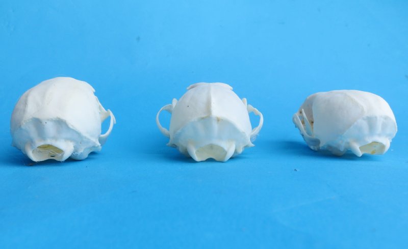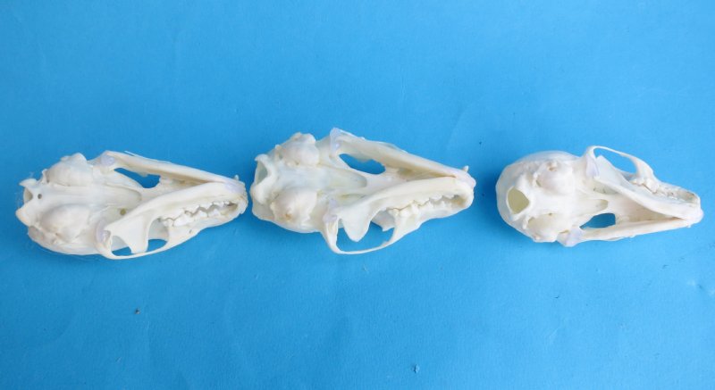 Wholesale American pine martin skulls for sale measuring between approximately 2-3/4 inches and 3-1/2 inches in size. These American pine martin skulls have been cleaned; however, there may be dark spots on some of the skulls. Their mouths have been glued shut, using hot melt glue.  We will select skulls that look similar to those pictured.  The skulls will have natural imperfections as they are real.