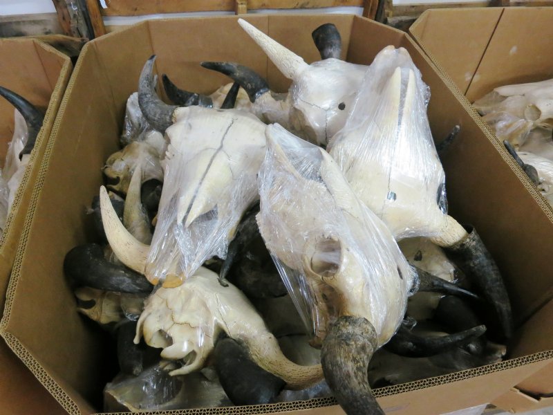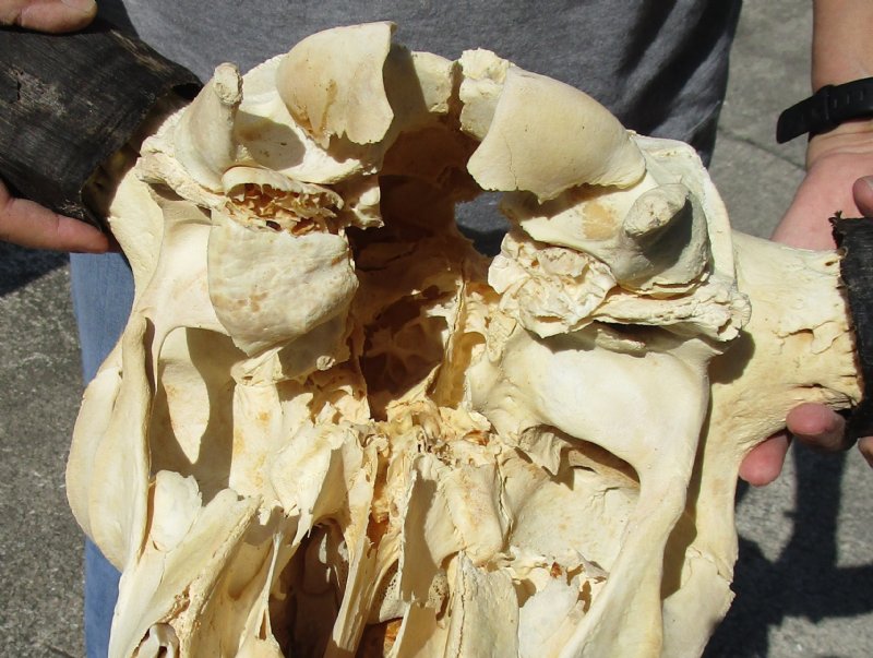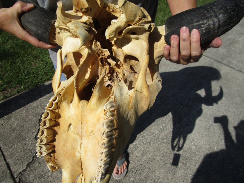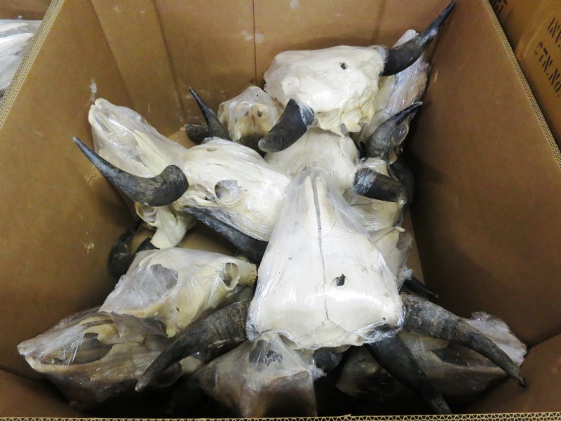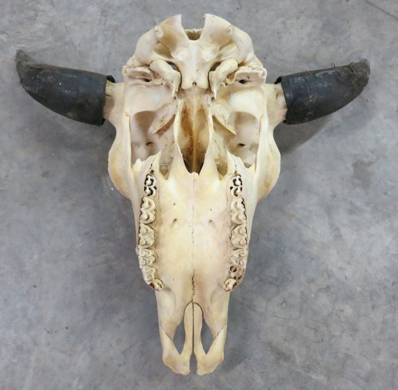 North American Bison Skull and horns wholesale, buffalo skull and horns, Bison bison, with approximately 23 inches wide to 27 inches wide horn spreads. The buffalo skull and horns will measure approximately 18 to 20 inches long, and their horns are removable. Buffalo skulls are perfect for rustic cabin decor, lodge decor and western themed decorating. All of these buffalo skulls have a hole in the top of the skull, bug casings, some will have a few missing teeth and rough horns, cracks and damage to back of skull, they will have a odor (smell). This is a real bison (buffalo) skull with horns and will have natural imperfections caused by the animal living in the wild.