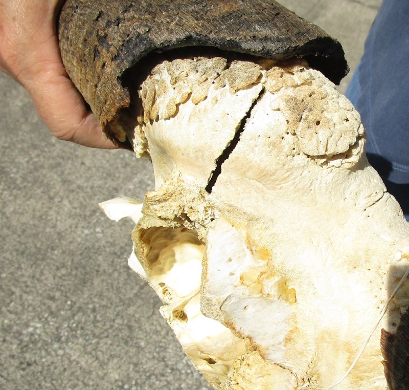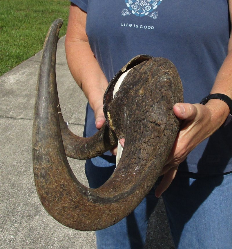 Male African black wildebeest skull plate with horns for cabin decor and lodge decor.   crack in skull plate - review photosThis black wildebeest skull plate has horns approximately 18-1/2 inches wide.