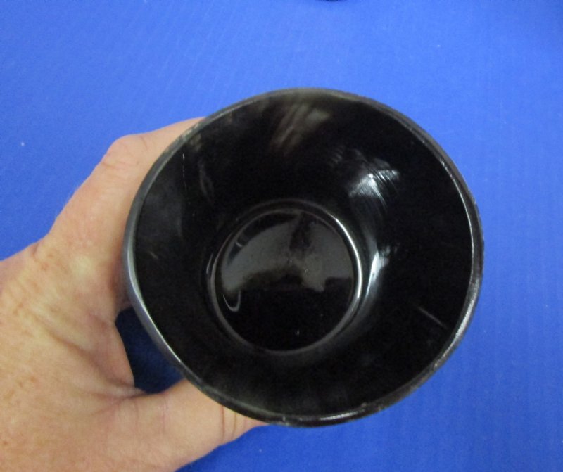 Wholesale Polished buffalo horn glass measuring approximately 4 inches tall.  The exterior has been hand polished. This horn glass makes a beautiful display item and while they hold liquid, we do not recommend drinking from them. The item will have a slight odor and may have minor scratches due to buffing and the natural material used. The variations in shape and color can only be made by nature; thus a horn may have natural blemishes which will not affect its use, but does verify its authenticity.