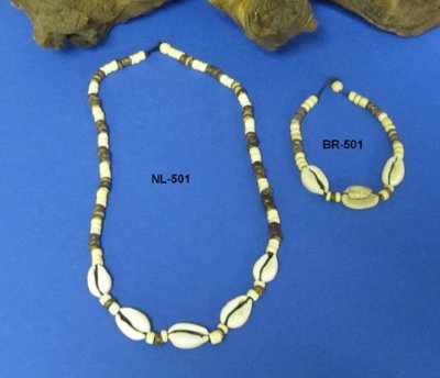 Wholesale Brown and Tan Coconut Beads with Cut Cowrie Shells 18 inch necklaces and 7-1/2 inch bracelets. These brown coconut cowrie shell necklaces and brown coconut with cowrie shell bracelets are worn by teens, ladies and men. Coconut necklaces and coconut bracelets are a must for souvenir and gift shops who cater to tourists looking for beach vacation gift ideas.