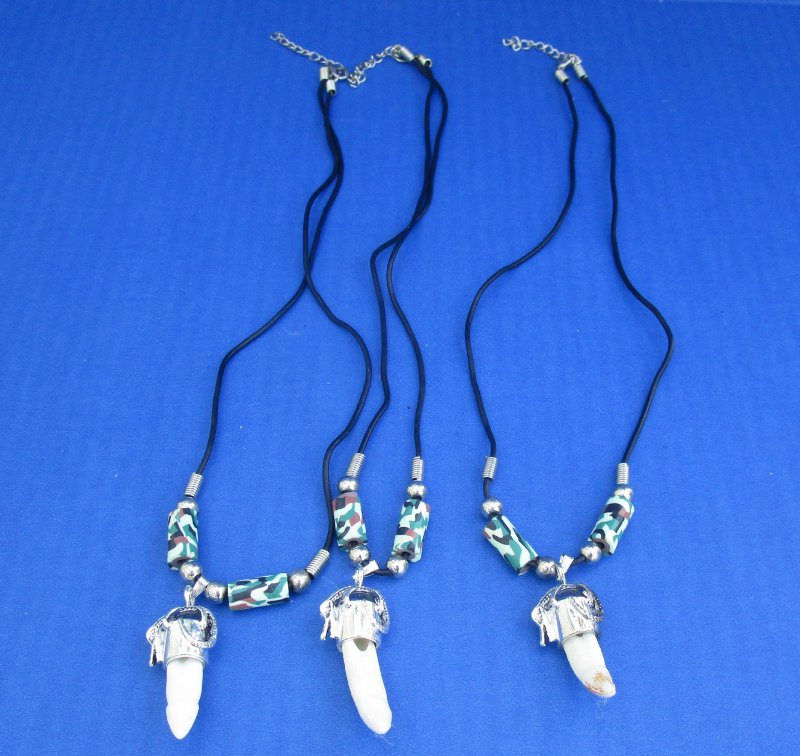 Wholesale Alligator tooth necklace measuring approximately 20 inches with 1/2 to 1-1/2 inch alligator tooth with camouflage beads and a tiny silver gator on a black leather strap. These necklaces are made with Real Alligator Teeth - Not Replicas.  They will vary in size, shape and coloring.  Some will have natural staining on the tooth. These alligator tooth necklaces make perfect birthday party favors and gifts for gator lovers.