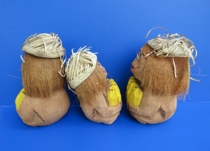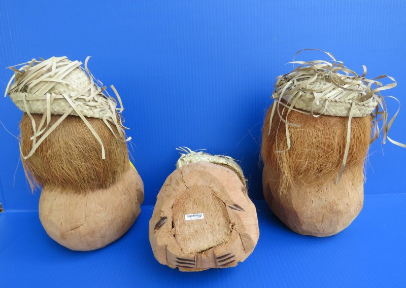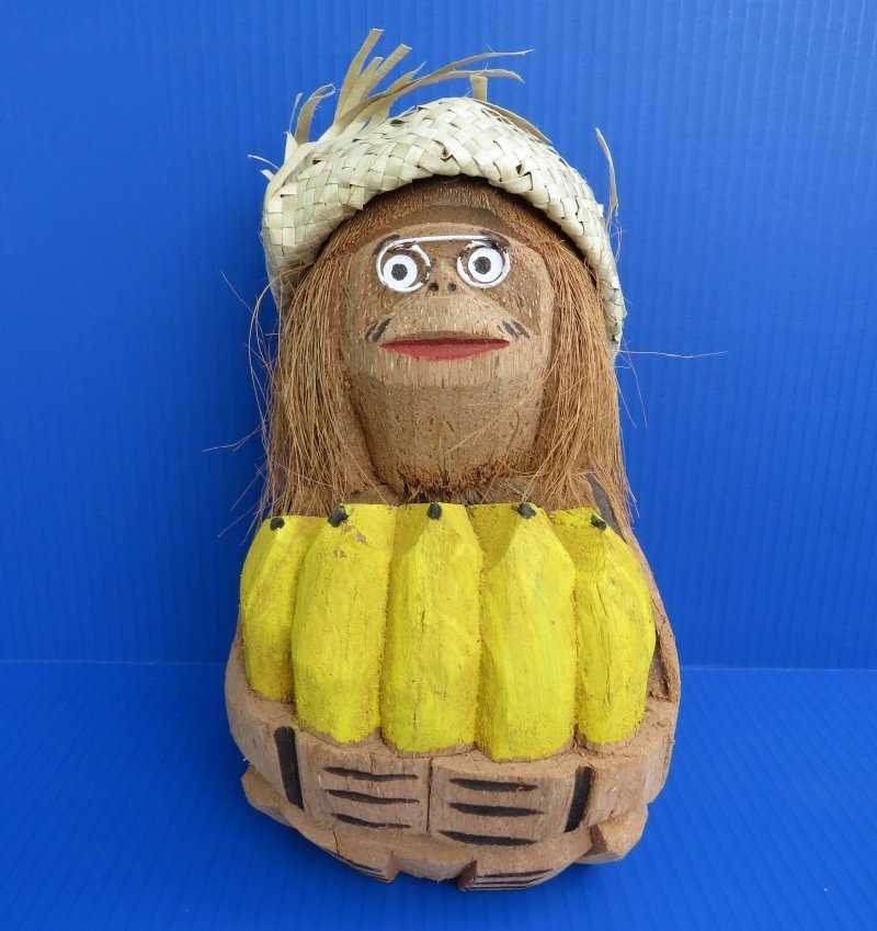 Wholesale Carved and Painted Coconut Monkey holding a bunch of bananas wearing a straw hat Novelty. This carved coconut monkey novelty is hand carved out of two real coconuts and measures approximately 10" to 11" high. This coconut monkey is the perfect retail novelty for beach shops and souvenir and gift shops catering to tourists. Coconut novelties are appreciated by all ages.