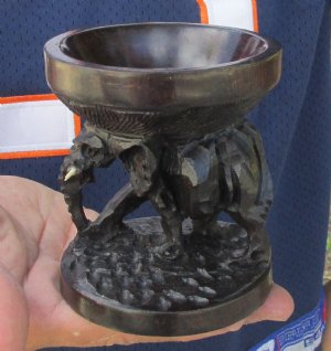 We have hand selected and photographed these carved wood elephant ostrich egg stands. These are elevated wooden ostrich egg stands in the shape of an elephant.