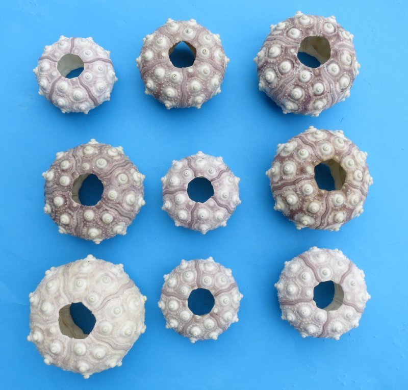 Wholesale sputnik sea urchins assorted sizes measure between 1-3/4 inches and 3 inches wide.   These sputnik urchins come in assorted sizes and make a nice addition to a seashell collection and are used in shell craft and in making Christmas ornaments.  The sputnik sea urchin resembles a land mine because of  the little nodules that cover its surface.. These shells have shades of purple and cream and are lightweight and fairly fragile.  Sold by the case