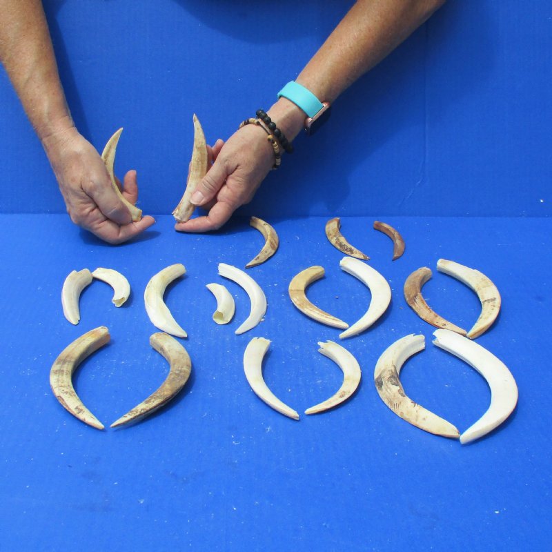 Lower split warthog tusks, (all of these tusk are split and some may have drill holes) measuring between approximately 3 inches and 8 inches measured around the curve of the tusk using a cloth tape measure -- NOT straight with a wood ruler.  The lower warthog tusks are much thinner and sharper than the upper tusks.  -Review all photos. Warthog tusks and warthog ivory is used for making knife handles, carving, making warthog handles for walking canes and for numerous taxidermy craft projects. Warthogs got their names from the bumps on their faces that look like warts. They also each have four tusks, two on each side of their snouts. The upper tusks are longer and curve toward each other. Warthogs are pigs that live in Africa south of the Sahara.