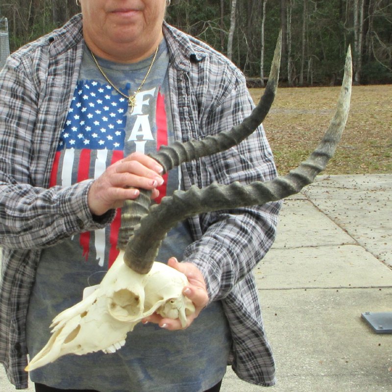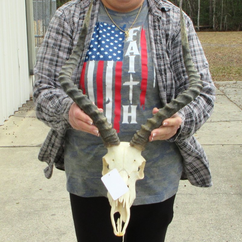Slight B Grade African Impala Skull (Aepyceros melampus) for sale, with horns measuring approximately 20 inches long. The skull measures approximately 10 inches long.  Missing a couple teeth, rough horn tips - Review all photos. You will receive the skull and horns shown in the photo. All horns are measured around the curve of the horn using a cloth tape measureAll of our skulls and horns are commercial grade and imperfect. They will have imperfections due to the natural aging process and living in the wild--scars, blemishes, rub areas, broken or missing teeth, bug bite marks, etc. This skull and horns were cleared by the U.S Fish and Wildlife Services and U.S Customs Services for legal entry into the United States. They were obtained from the African Government's Culling Program.