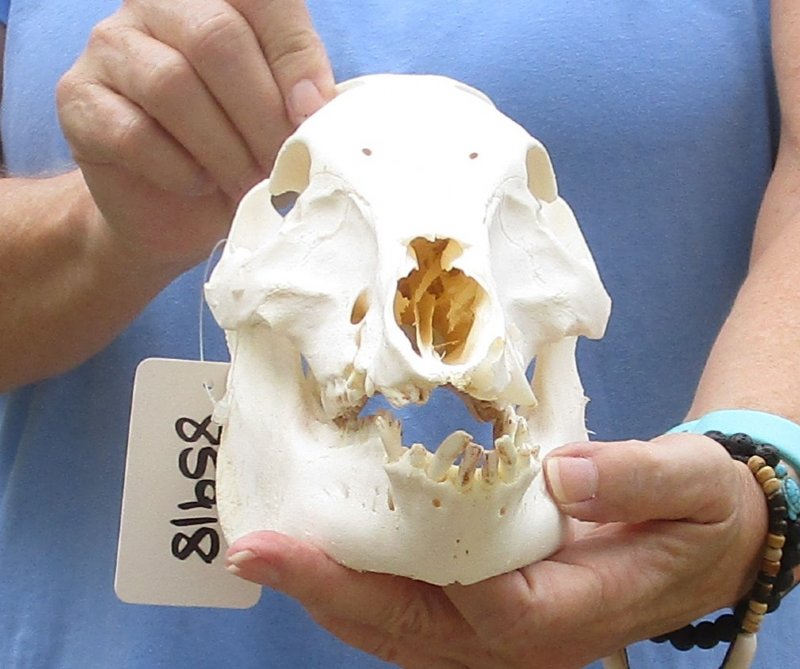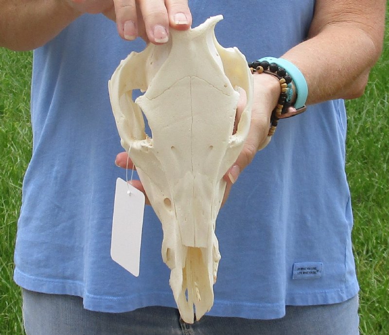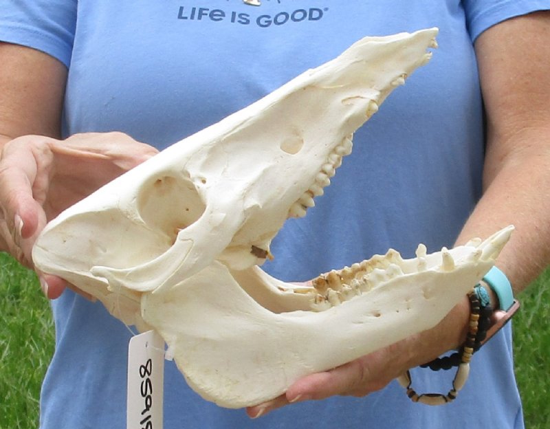 This is a B-Grade wild boar skull/wild pig skull measuring approximately 10 inches long by 4-1/2 inches wide. - Review all photos. These boar skulls are commercial grade and will have broken and missing teeth, excessive glue and oily discoloration. This wild boar skull, wild pig skull, has been cleaned (but not whitened) and is ready for display. Wild boar skulls are perfect for skull collectors and collectors of weird and unusual items.