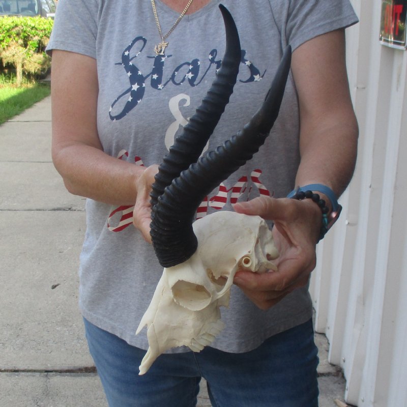 Male Springbok Skull (Antidorcas marsupialis) for sale with horns measuring approximately 10 inches, measured around the curl of the horns and skull approximately 8 inches. Review all photos. This springbok skull and horns is from a wild African springbok and will have imperfections caused by the animal living in the wild and the natural aging process.