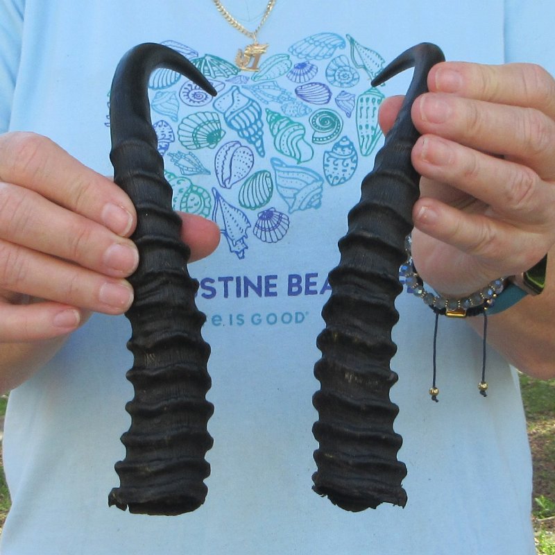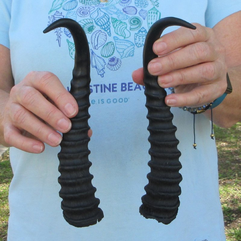 Matching pair of male springbok (Antidorcas marsupialus) horns from wild African male springbok measuring approximately 10 inches long measured around the curve of the horns -- not straight.  Review photos. These are real horns and will have natural imperfections from the animal living in the wild.