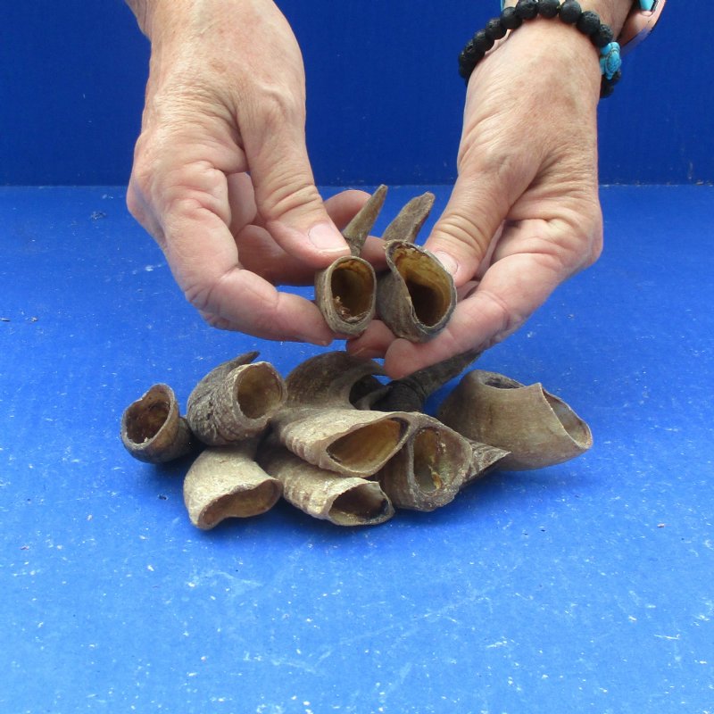 10 piece lot of sheep horns, ram horns imported from India and Africa. These ram horns, sheep horns measure under 5 inches measured around the curl of the horn. Review all photos. Ram horns and sheep horns are used in horn craft, making blowing horns, furniture legs, lamps, sconces, knife handles, cane handles, inlaid crafts and numerous other taxidermy crafts.