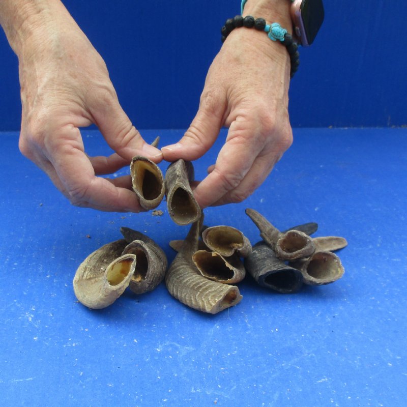 10 piece lot of sheep horns, ram horns imported from India and Africa. These ram horns, sheep horns measure under 5 inches measured around the curl of the horn. Review all photos. Ram horns and sheep horns are used in horn craft, making blowing horns, furniture legs, lamps, sconces, knife handles, cane handles, inlaid crafts and numerous other taxidermy crafts.