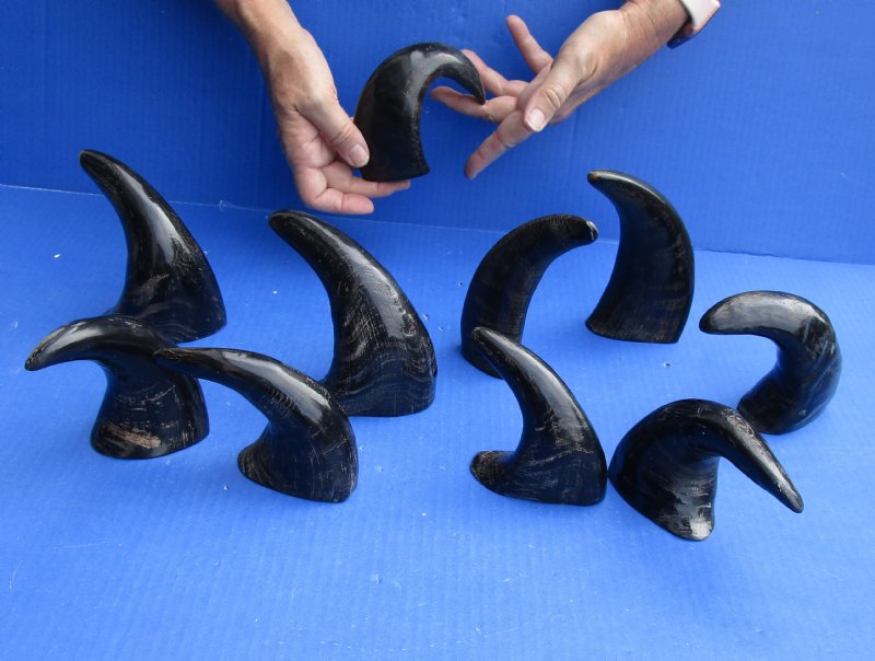 10 piece lot of Semi-polished buffalo horn for sale, Bubalus bubalis, from an Indian water buffalo measuring approximately 6 to 8 inches measured around the curve of the horn with a cloth tape measure, not straight up and down with ruler.  Semi polished buffalo horns will vary in coloring, size and shape and are used for making animal horn jewelry, in cabin decor, rustic decorating, in making knife and cane handles, for carving, in the art of scrimshaw and in making inlaid instruments.