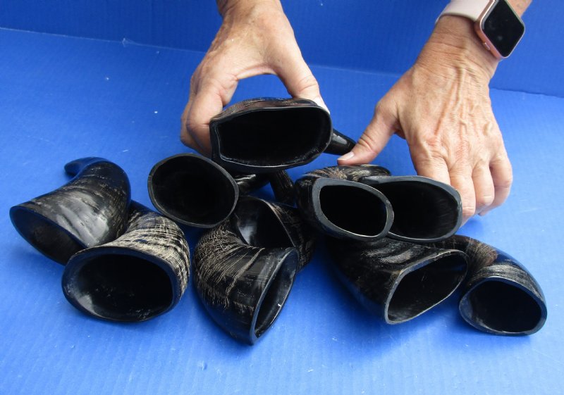 10 piece lot of Semi-polished buffalo horn for sale, Bubalus bubalis, from an Indian water buffalo measuring approximately 6 to 8 inches measured around the curve of the horn with a cloth tape measure, not straight up and down with ruler.  Semi polished buffalo horns will vary in coloring, size and shape and are used for making animal horn jewelry, in cabin decor, rustic decorating, in making knife and cane handles, for carving, in the art of scrimshaw and in making inlaid instruments.
