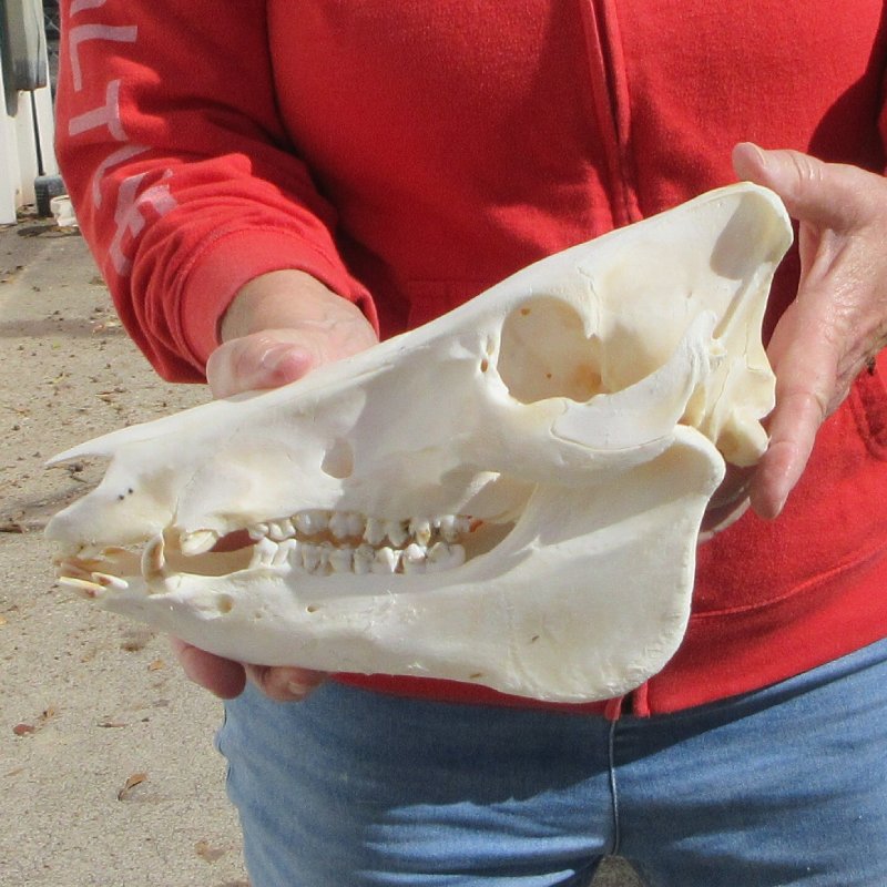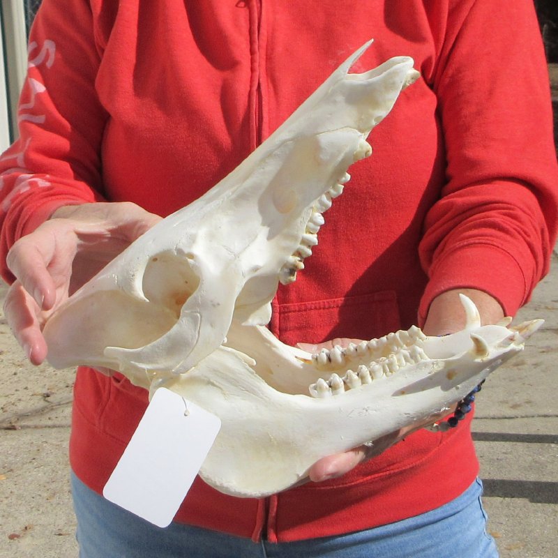 This is a Wild boar skull, wild pig skull measuring approximately 11-1/2 inches long and 4-1/2 inches wide. These boar skulls are commercial grade and will have broken and missing teeth, excessive glue and oily -  Review all photos. This wild boar skull, wild pig skull, has been cleaned (but not whitened) and is ready for display. Wild boar skulls are perfect for skull collectors and collectors of weird and unusual items.