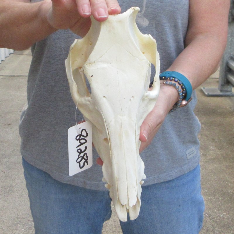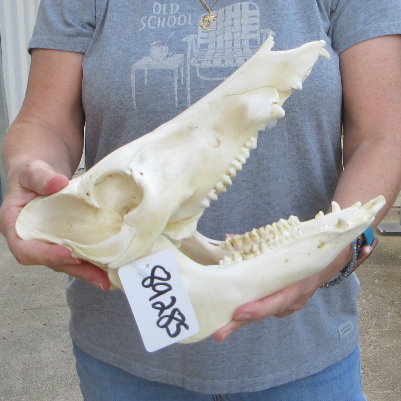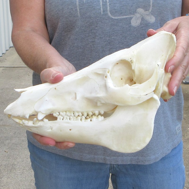 This is a Wild boar skull, wild pig skull measuring approximately 11-1/2 inches long and 5 inches wide. These boar skulls are commercial grade and will have broken and missing teeth, excessive glue and oily -  Review all photos. This wild boar skull, wild pig skull, has been cleaned (but not whitened) and is ready for display. Wild boar skulls are perfect for skull collectors and collectors of weird and unusual items.