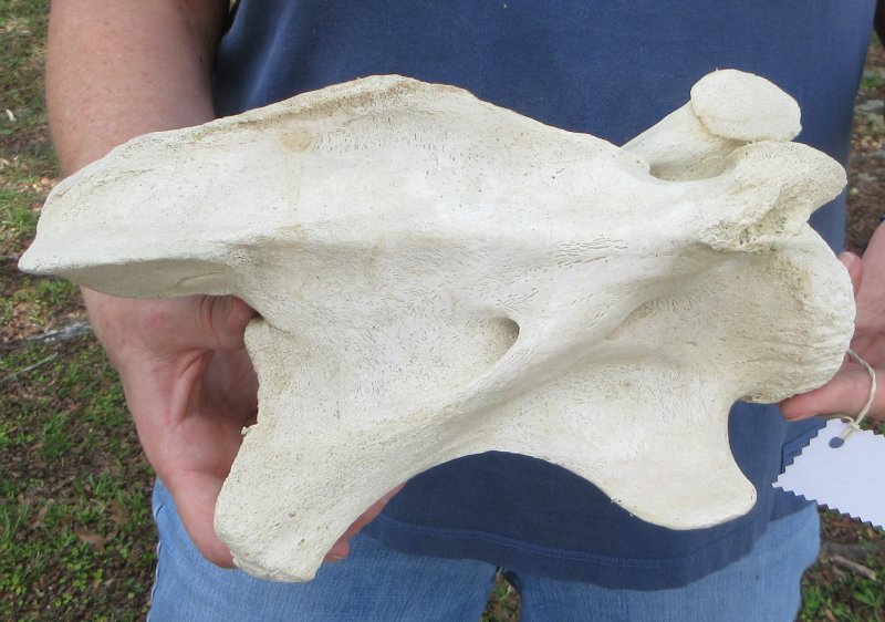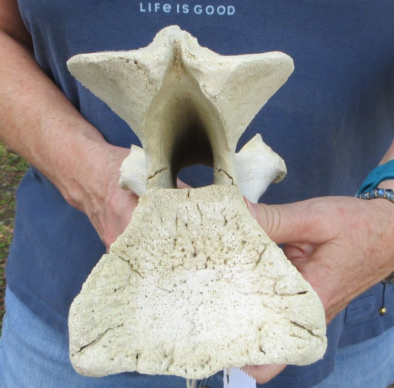 Giraffe Neck Vertebra Bone (Giraffa camelopardalis) for sale measuring approximately 11-1/4 inches long and 6-3/4 inches wide.  Discolored - Review all photos. This giraffe vertebra bone is from a real African Giraffe's neck and will have some stains and natural imperfections normally found on all wild animal bones.