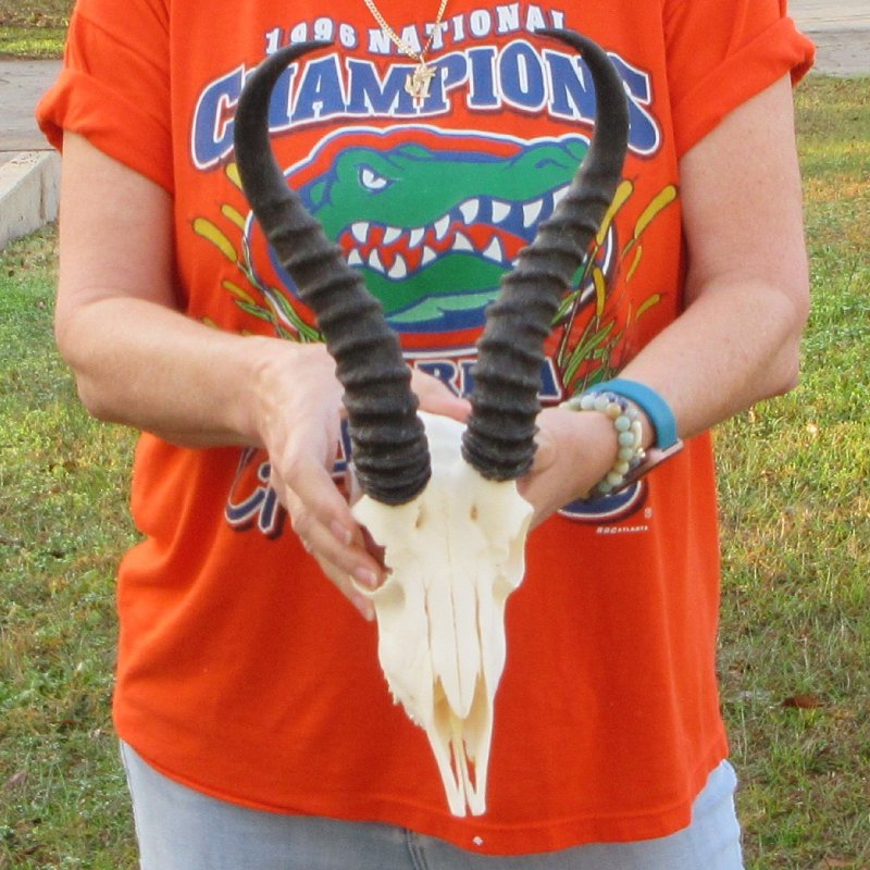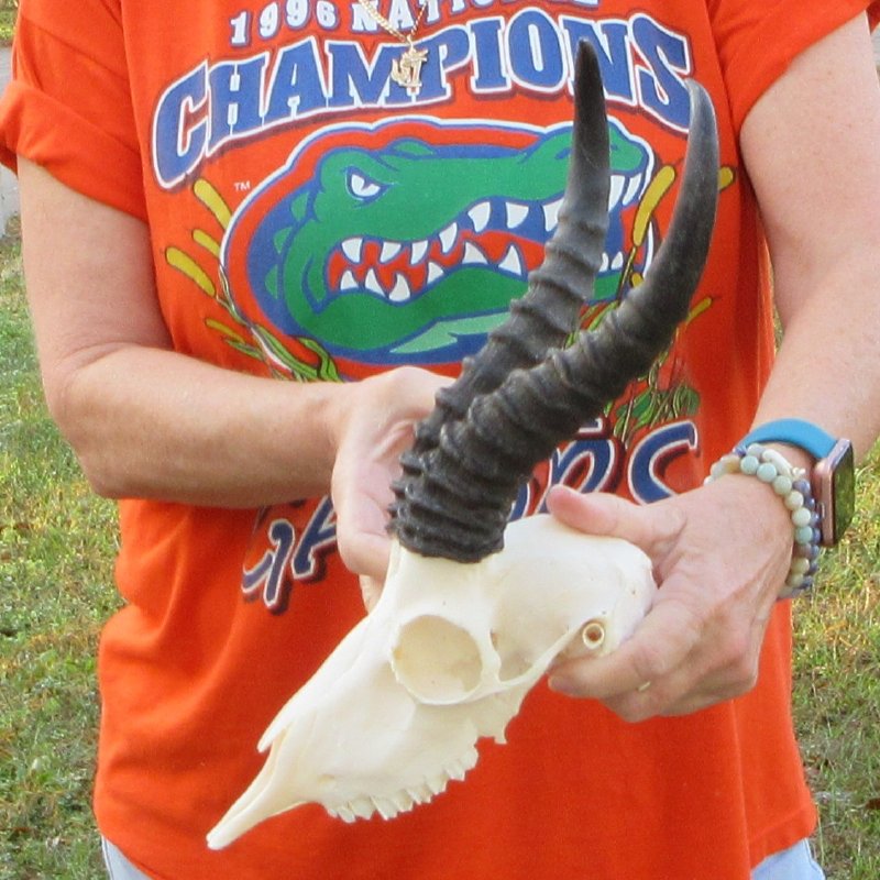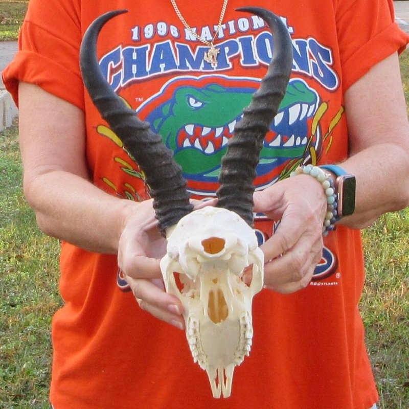 Male Springbok Skull (Antidorcas marsupialis) for sale with horns measuring approximately 11-1/4 inches, measured around the curl of the horns and skull approximately 9 inches. - Review all photos. This springbok skull and horns is from a wild African springbok and will have imperfections caused by the animal living in the wild and the natural aging process.