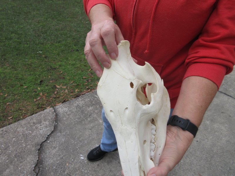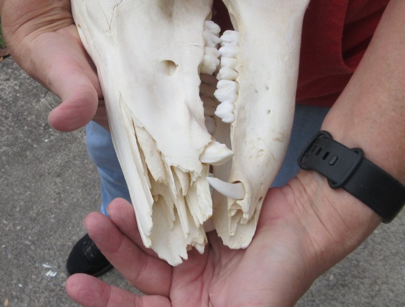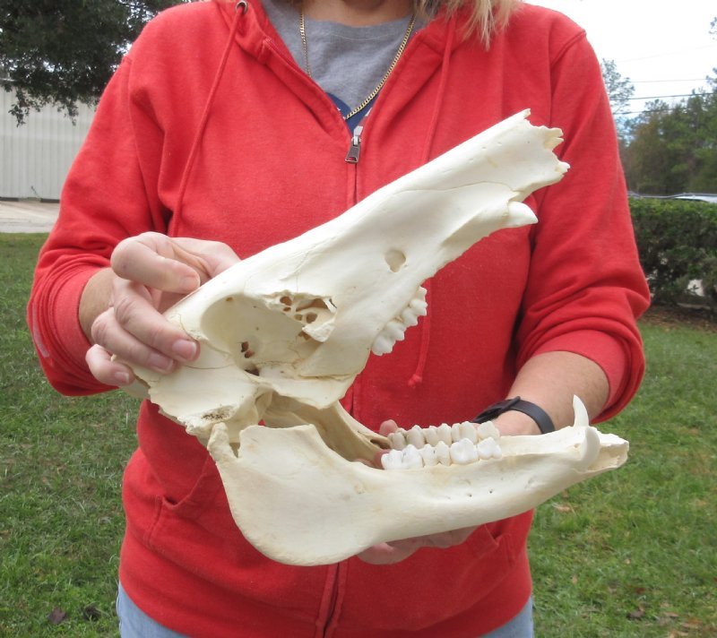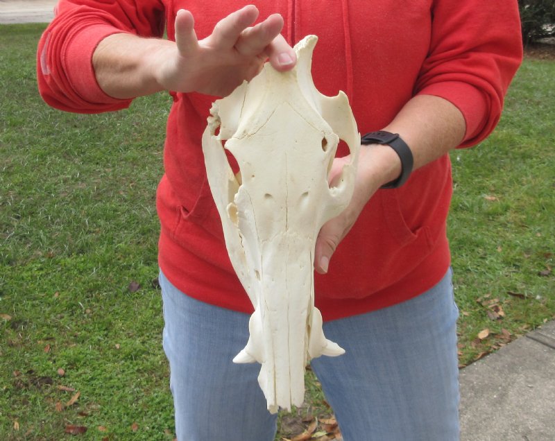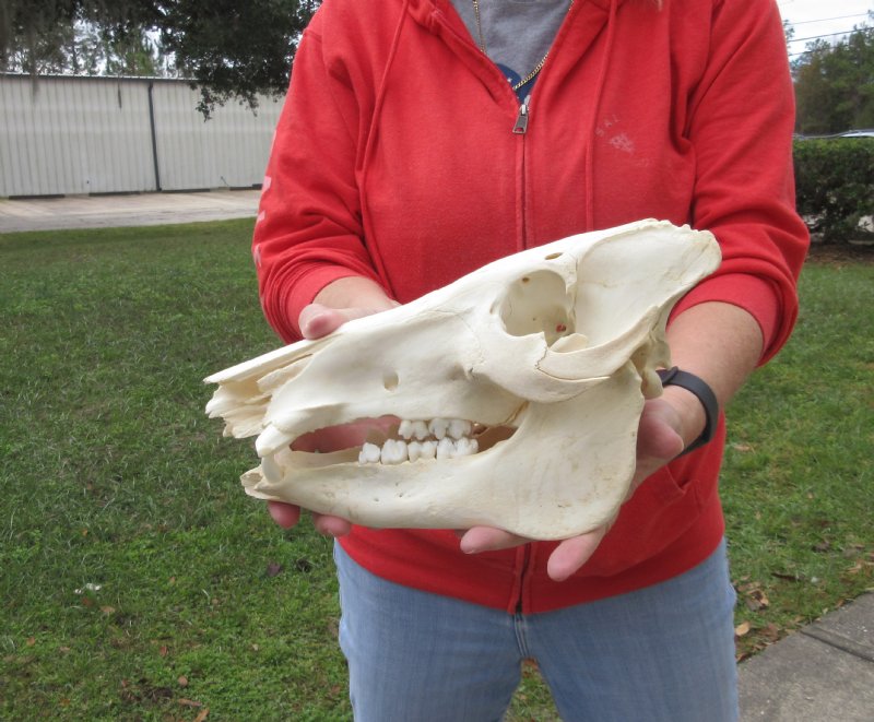 C-Grade 11 inches long and 5 inches wide African Bushpig skull, Potamochoerus larvatus.   This is a real bushpig and will have imperfections from the animal living in the wild and aging, such as: missing teeth, small holes, cracks, indentations, blemishes, scars, etc - review photos. The Bushpig is a member of the pig family and lives in forests, woodland, riverine vegetation and reedbeds in East and Southern Africa. Bushpigs are mainly nocturnal. Bushpigs are quite social animals and are found in sounders of up to 12 members. A typical group will consist of a dominant male and a dominant female, with other females and juveniles accounting for the rest.