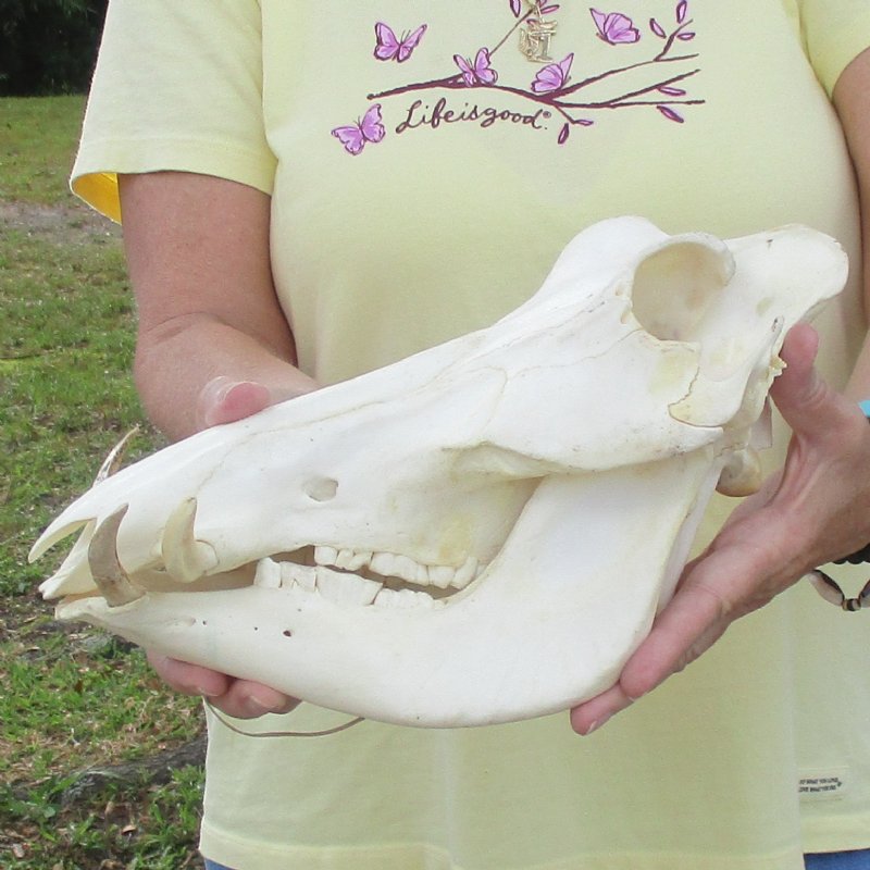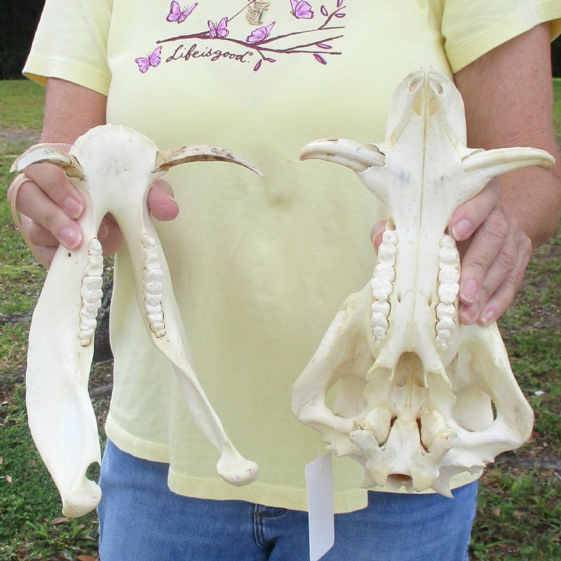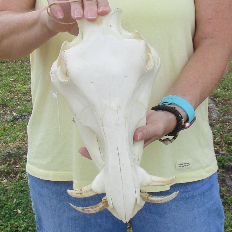African warthog skull for sale (Phacochoerus aethiopicus) with ivory tusks. The skull measures approximately 11 inches long. The top ivory tusks measure, around the curve, approximately 2-1/2 inches long. - Missing teeth. Review all photos. This warthog skull was harvested in South Africa and cleared for entry into the United States by the U.S. Department of Fish and Wildlife and U.S. Customs.