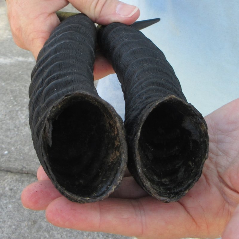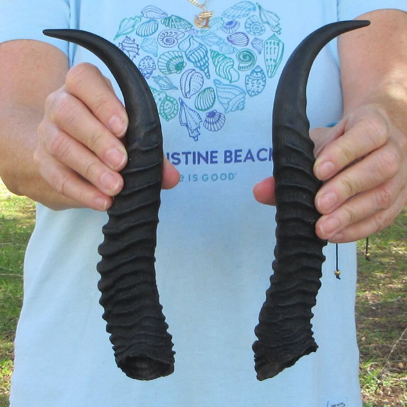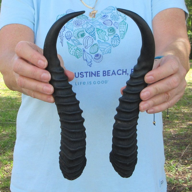 Matching pair of male springbok (Antidorcas marsupialus) horns from wild African male springbok measuring approximately 11 inches long measured around the curve of the horns -- not straight.  Review photos. These are real horns and will have natural imperfections from the animal living in the wild.