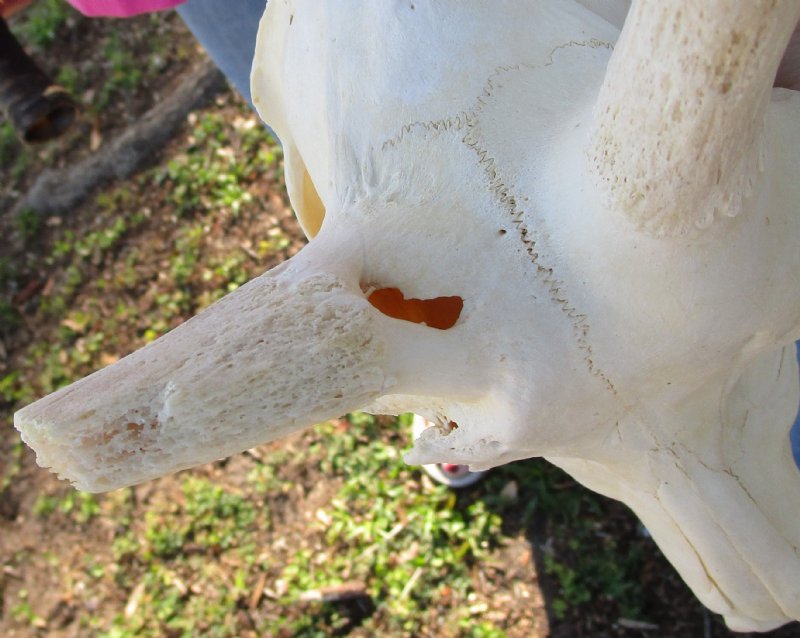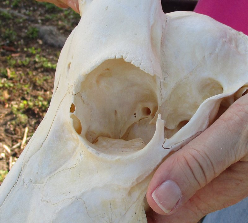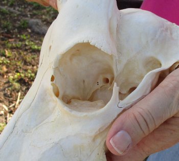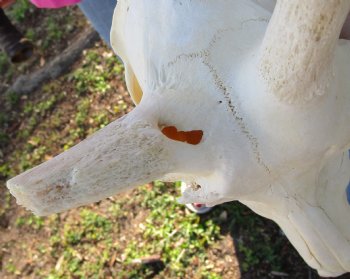 This is a real Male Blesbok Skull with Pathology (Damaliscus dorcas phillipsi) measuring approximately 11 inches. The horns measure approximately 13 inches around the curve of the horns - not straight with a wood ruler. This Blesbok has a hole in the skull where the bone has healed, the skull is dented also, side bone broke - Review all photos. This is a real blesbok skull with horns and will have imperfections caused by the animal living and aging in the wild.