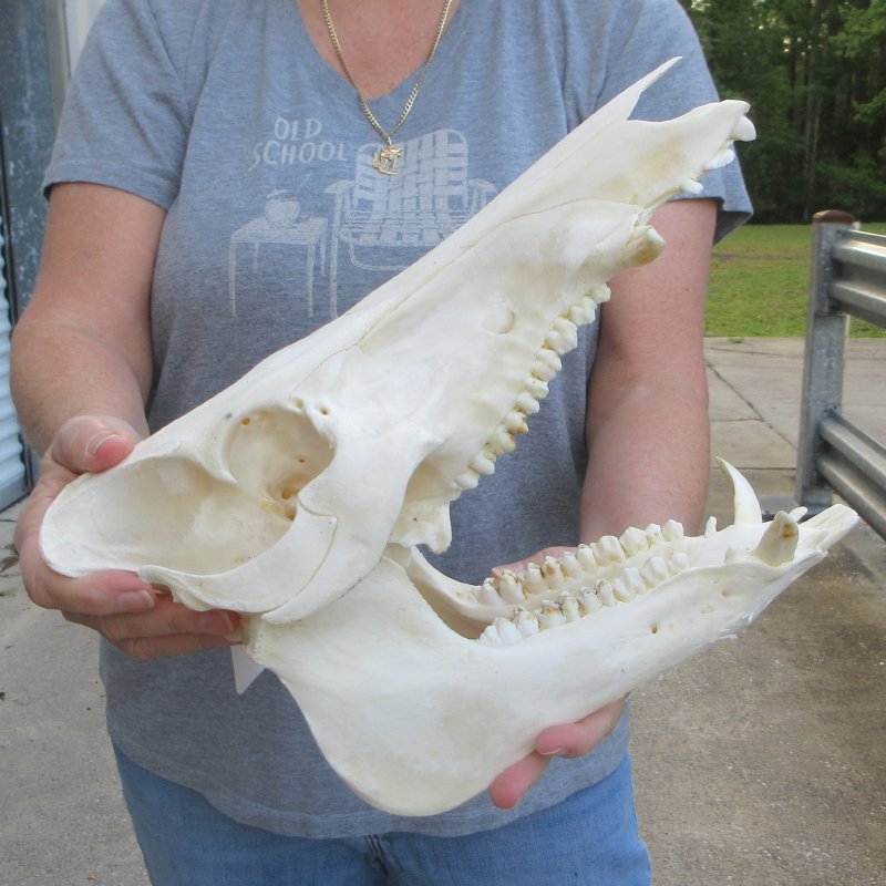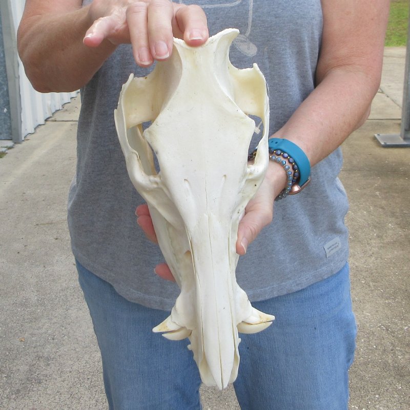 This is a Wild boar skull, wild pig skull measuring approximately 12-1/2 inches long and 5-1/2 inches wide. These boar skulls are commercial grade and will have broken and missing teeth, excessive glue and oily -  Review all photos. This wild boar skull, wild pig skull, has been cleaned (but not whitened) and is ready for display. Wild boar skulls are perfect for skull collectors and collectors of weird and unusual items.