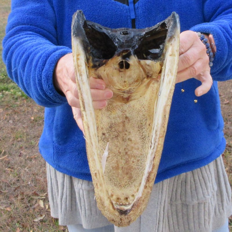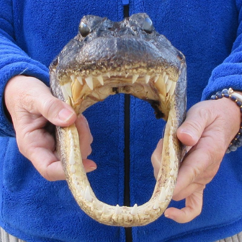 This alligator head measures approximately 12 inches long and 5-1/2 inches wide. This is a real alligator head -- NOT a replica. It will have missing and worn teeth, cuts, scrapes and scars -- Review all photos.  Alligator head souvenirs are a profitable retail product for beach shops, souvenir and gift stores catering to gator football fans, tourists, reptile collectors, teachers, students, and collectors of unusual items.  A taxidermy process cures the alligator skin and the alligator skull so it will be preserved for years.  These gator heads come from gator farms who harvest the gators for their meat and hide.